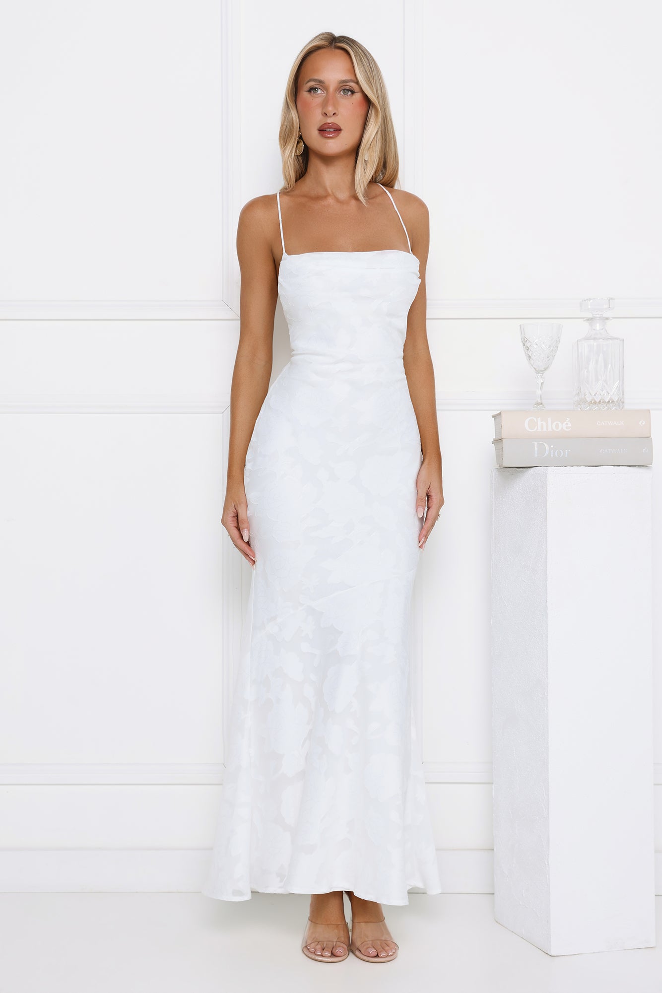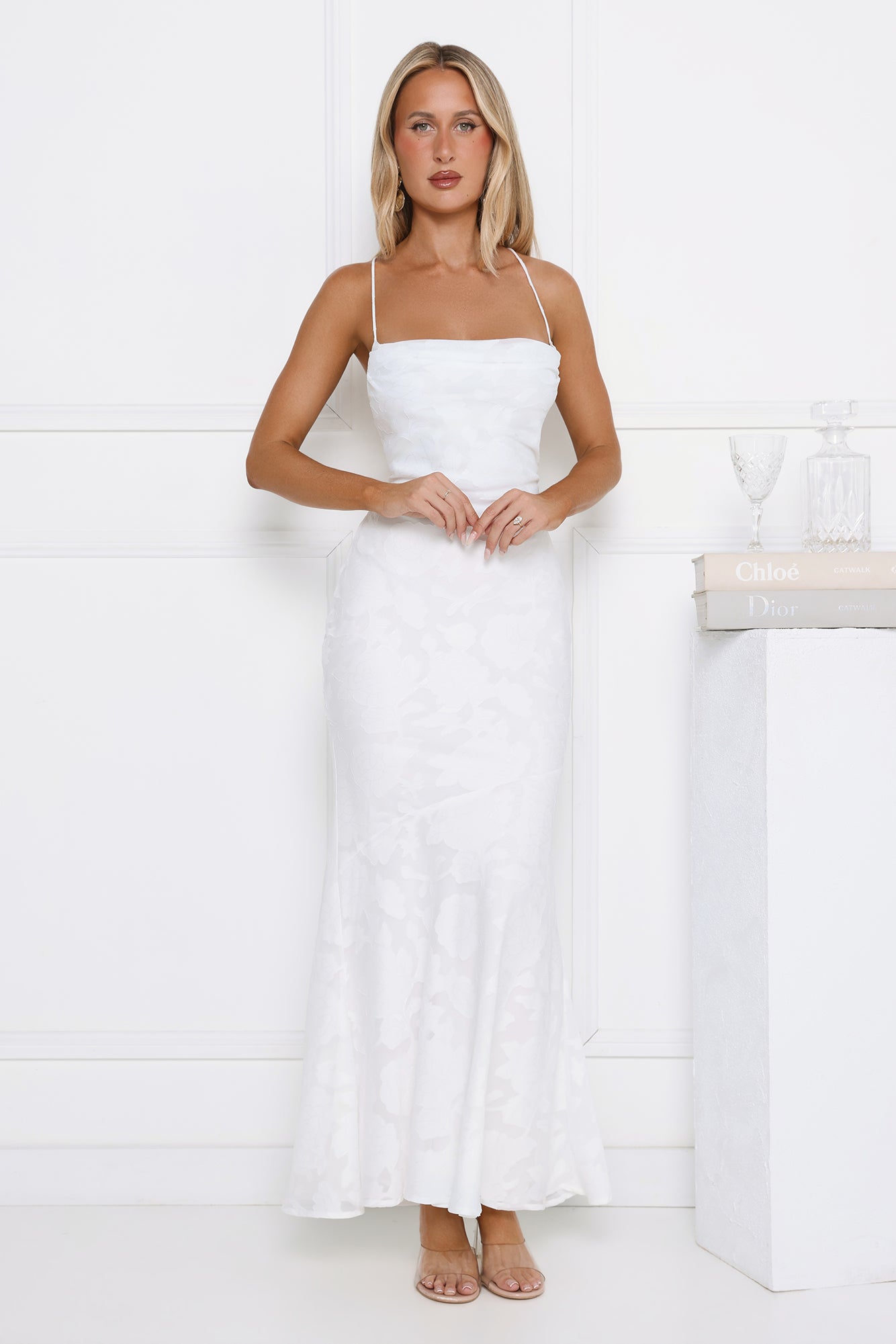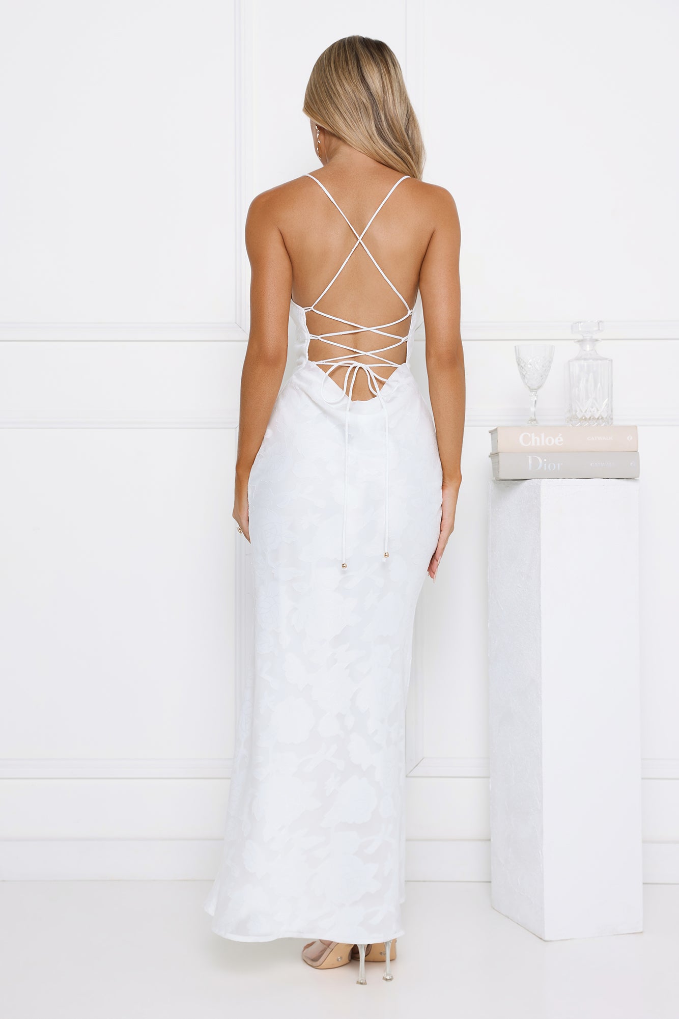 The Bridge To Wonderland Maxi Dress features a textured design fabric. a subtle cowl neck. and a crisscross back. Pair it with delicate heels and a clutch for an elegant. dreamy vibe.