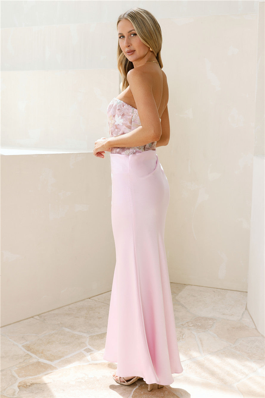 Step into the spotlight with the City Lights Chic Strapless Satin Maxi Dress. This stunning dress features a strapless satin base. an embroidered mesh top adorned with sparkling sequins. and a gathered waist that flatters your silhouette. Elevate your look with strappy heels and jewellery to let the sequined detailing shine.