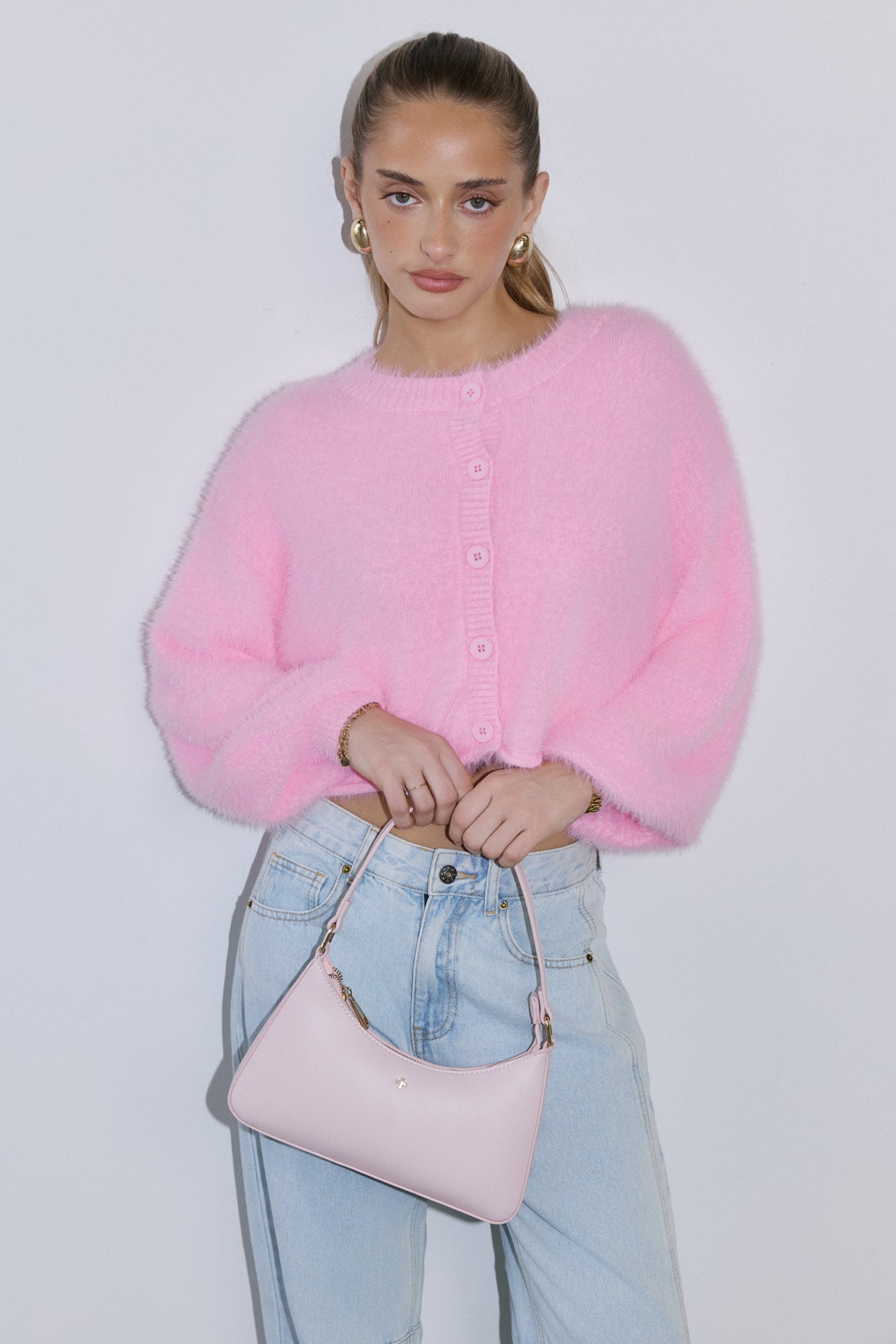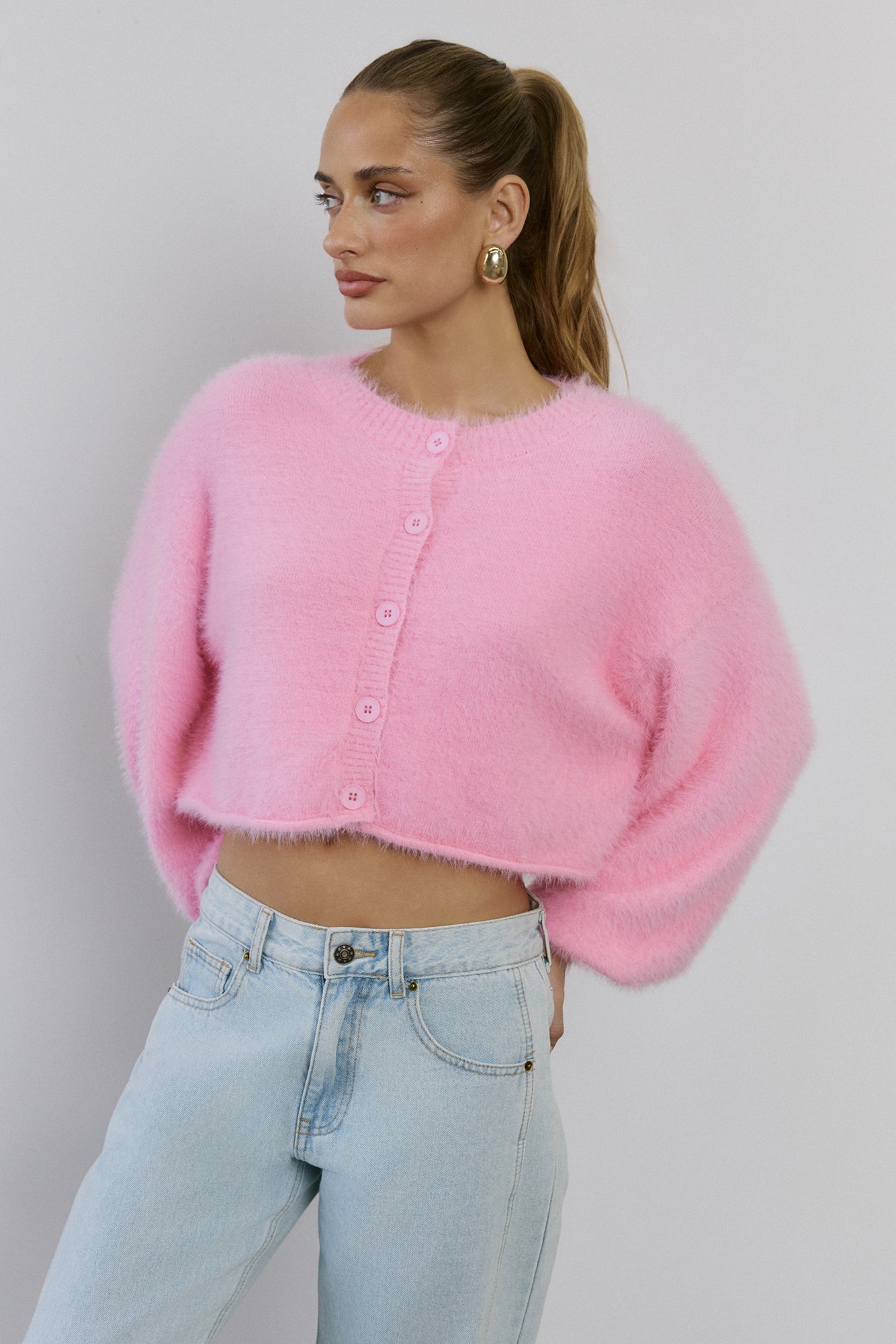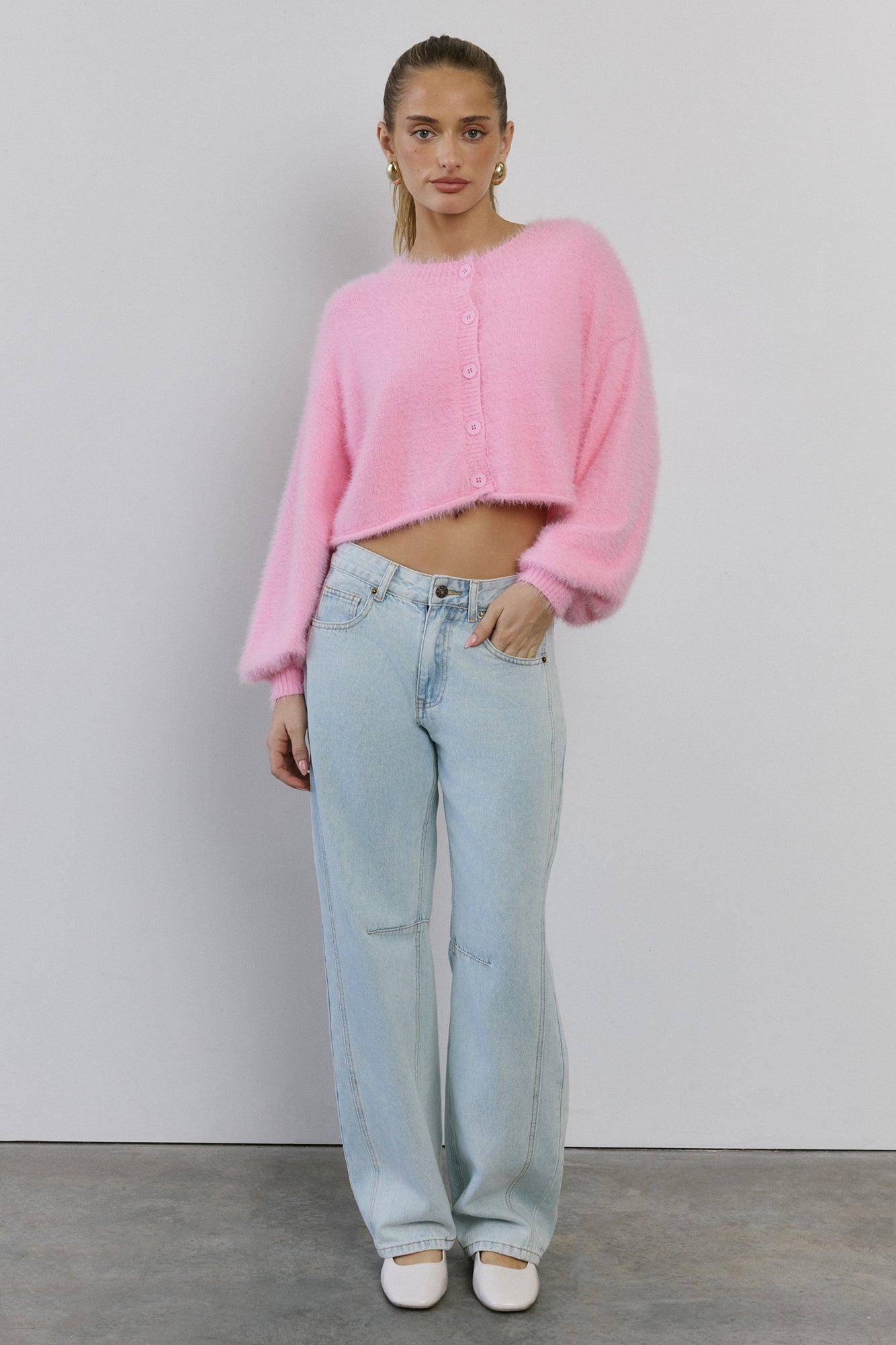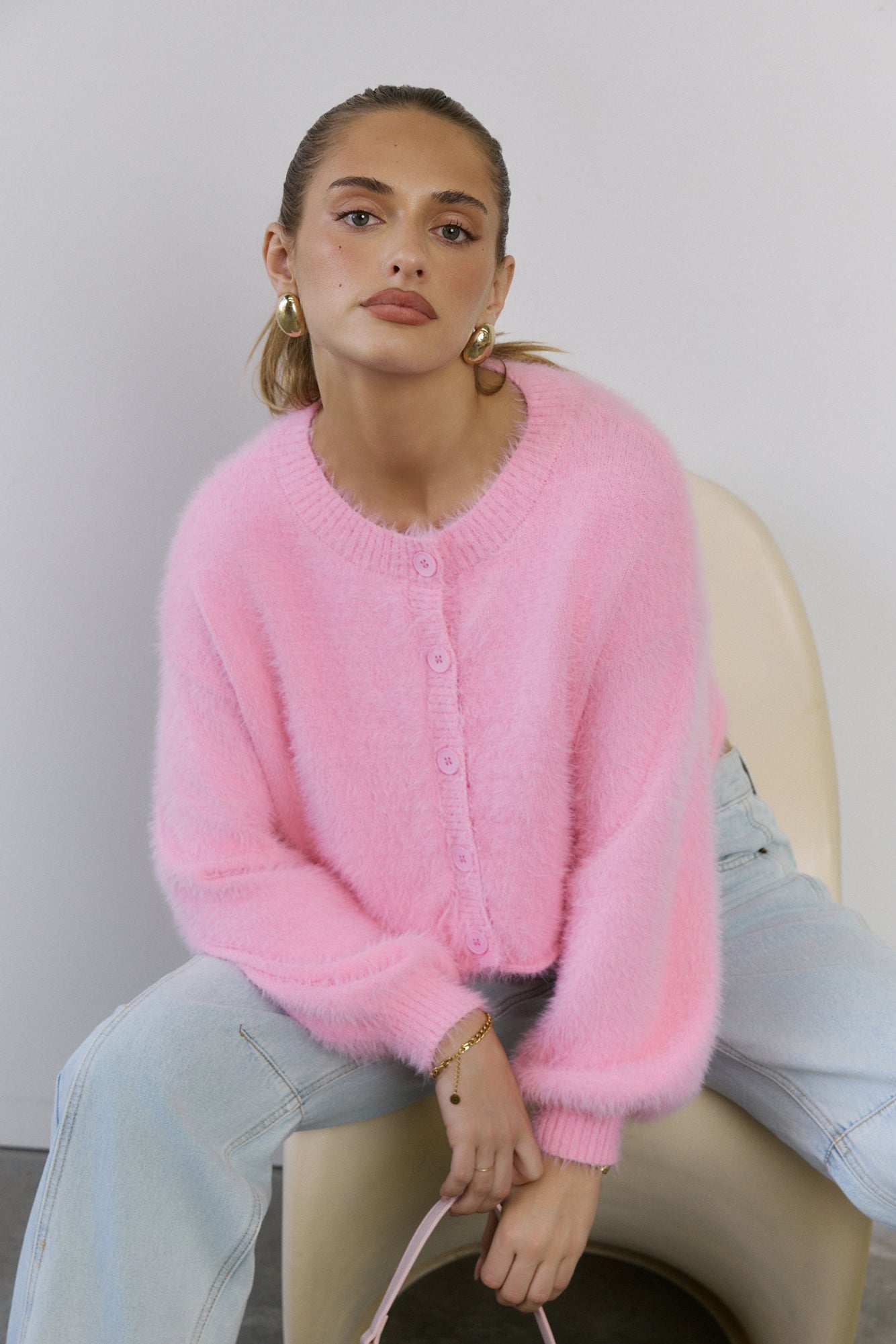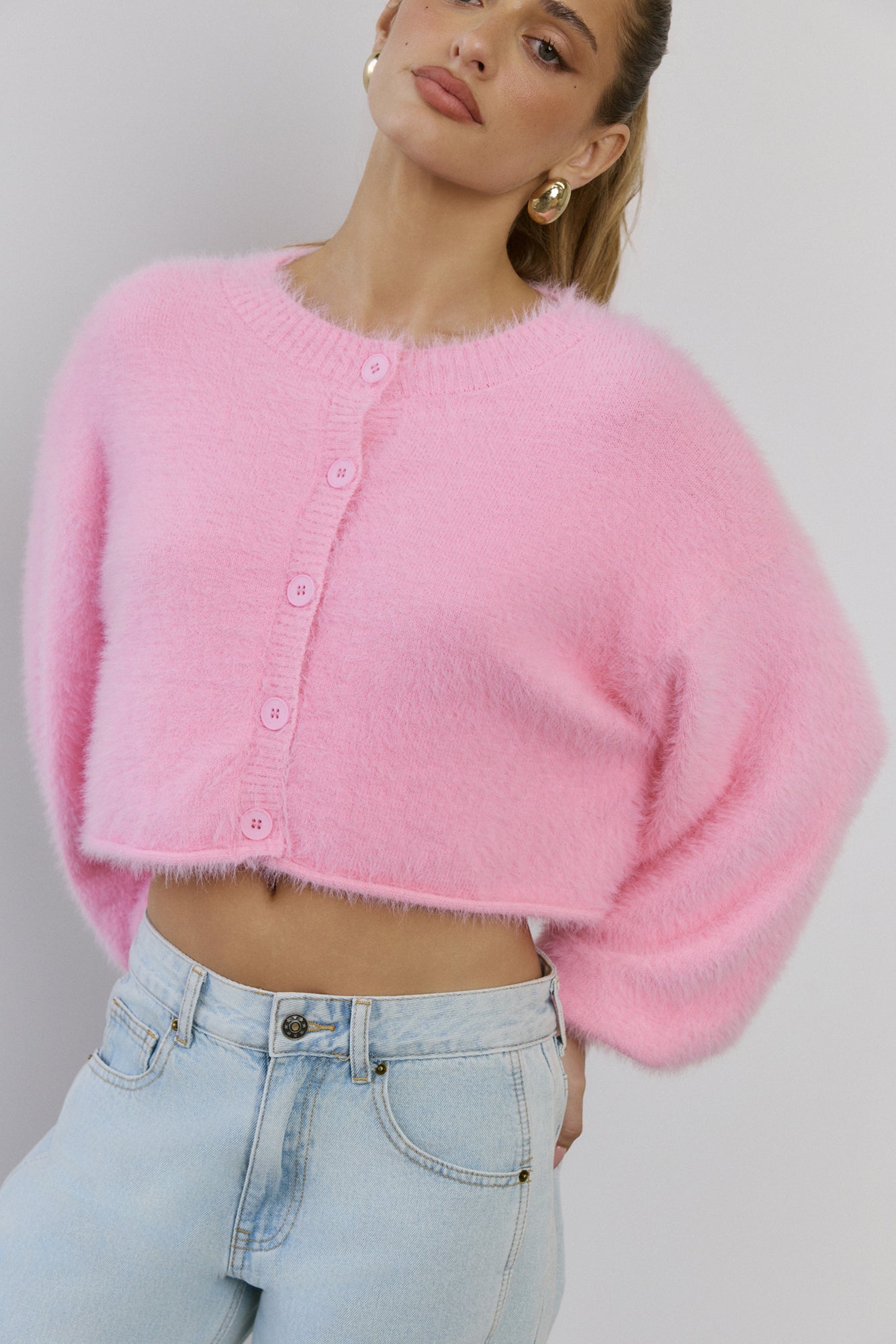 The Cloud Nine Fluffy Cardigan is your go-to for cosy. elevated style. Made with soft. stretch. fluffy knit. this long-sleeve. button-front cardigan features cuffed sleeves. giving you a modern. chic look that pairs perfectly with any outfit.