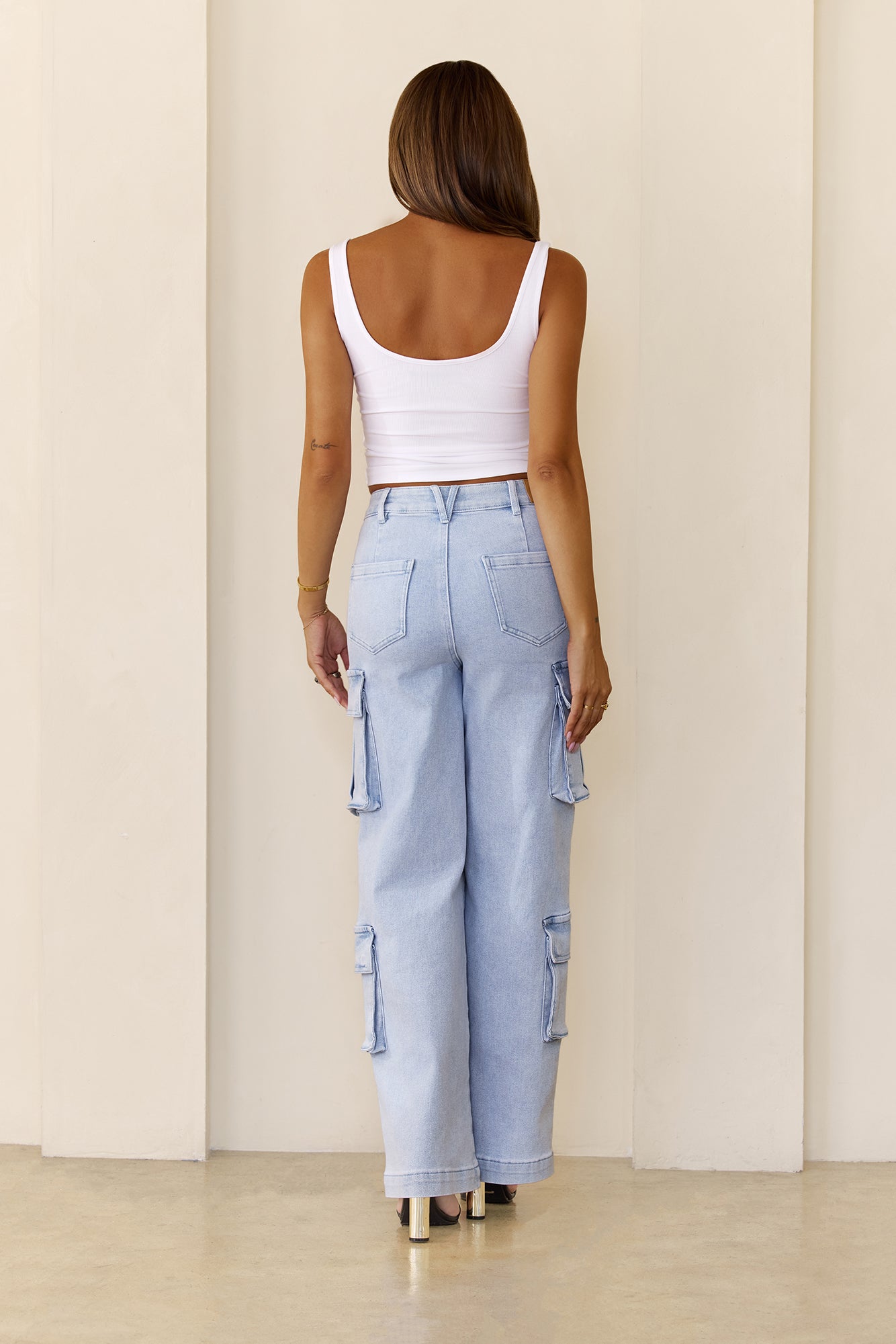 Meet your new denim essential — the DNM High Rise Cargo Denim Jeans! Designed with a high rise. straight leg. and slim top block. these jeans feature stretch denim. cargo-style side pockets. and Hey Mollys's signature branded patch and silver rivets. Style them with a fitted crop or oversized tee for an effortless off-duty look.