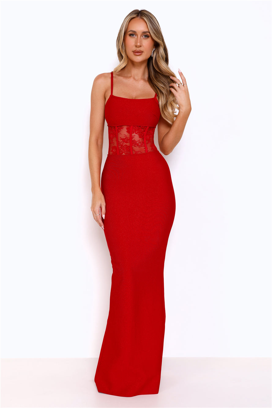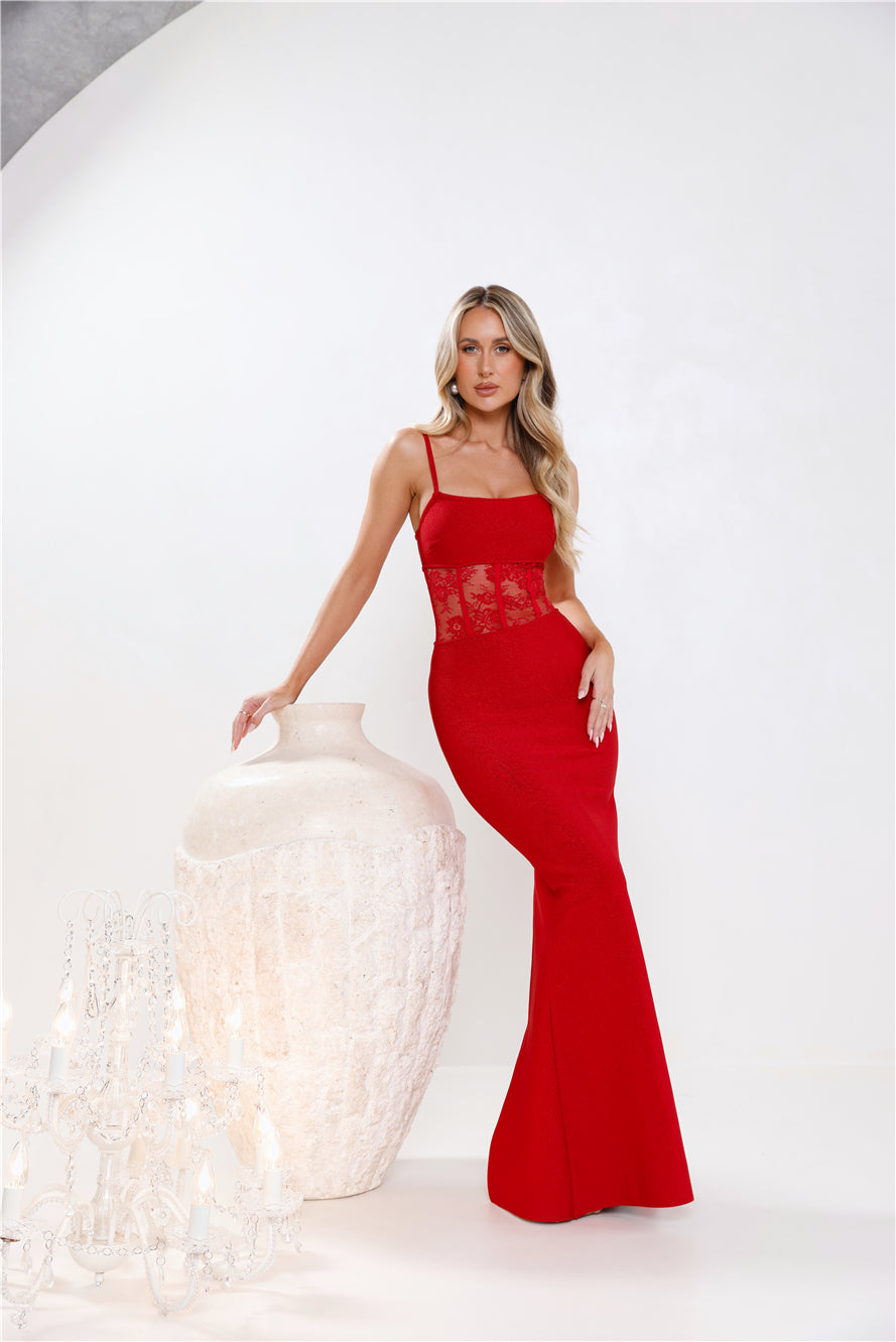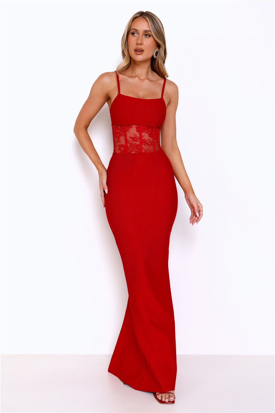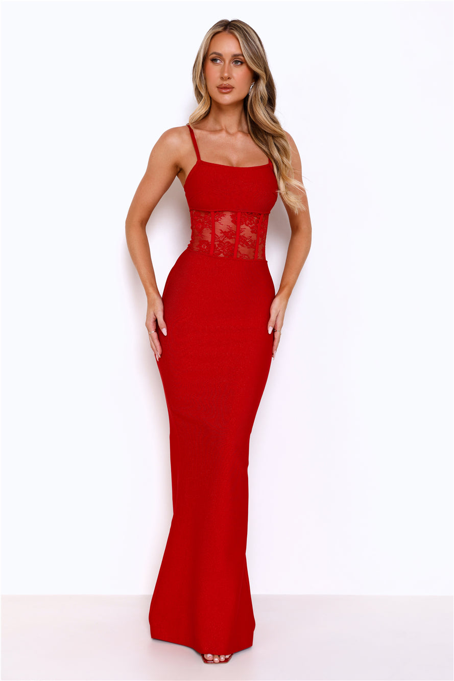Get ready to steal all the attention in the Eyes On The Prize Bandage Glitter Maxi Dress. Featuring a smoothing bandage fabrication with glitter. a lace bodice. and a fit-to-flare silhouette. Style with heels and sparkly accessories.