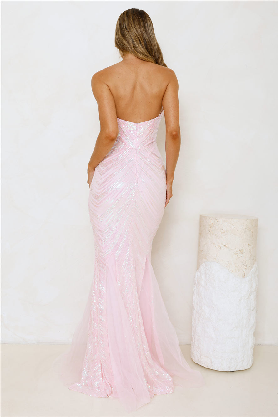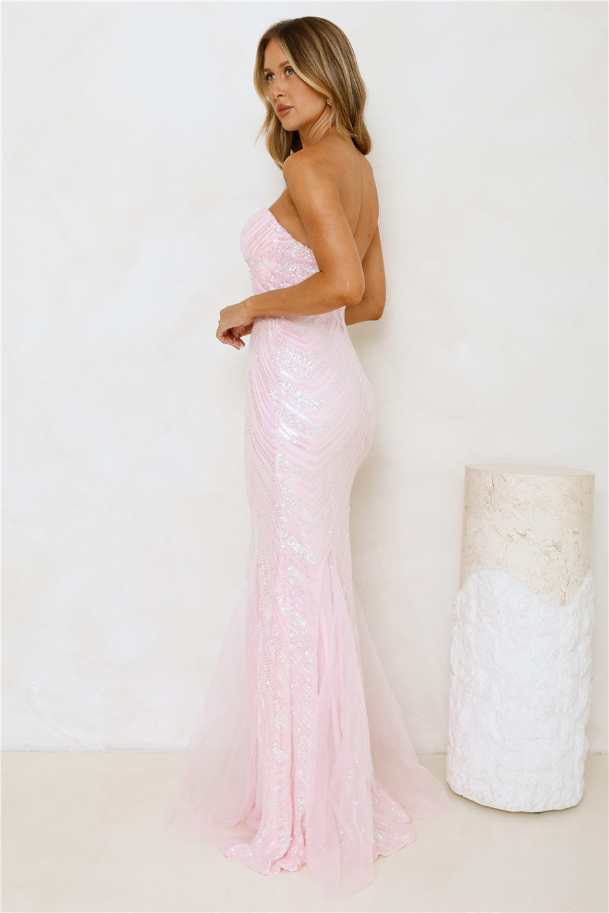 The Fancy Dressed Strapless Sequin Maxi Dress features a boned bodice with padding for a structured fit. shimmering sequins for added glam. and a tulle design at the hem. making it the perfect choice for any special occasion. Style with heels.