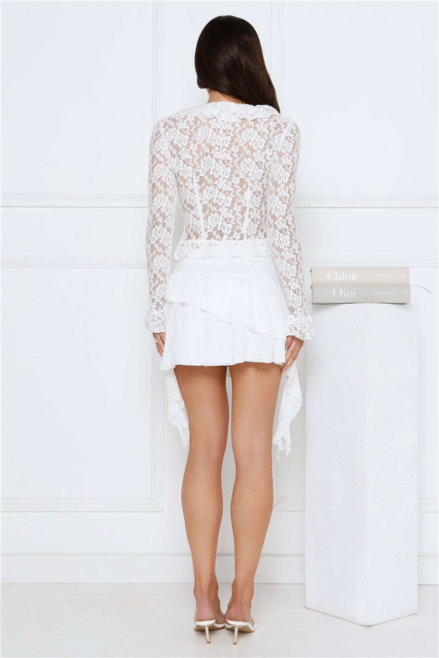 Turn heads at every party in the Long Nights Long Sleeve Top. featuring delicate lace. frill cuffs and trim. buttoned front. and a slightly cropped fit for flirty. fun vibes.