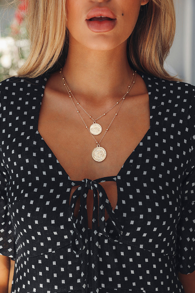 The Lost In The Fire Necklace is our go-to style when we're in the mood for layered bling. This necklace features a double coin design. ball details on the chain and it's an adjustable fit. We love wearing ours with a black beret and gold highlighter