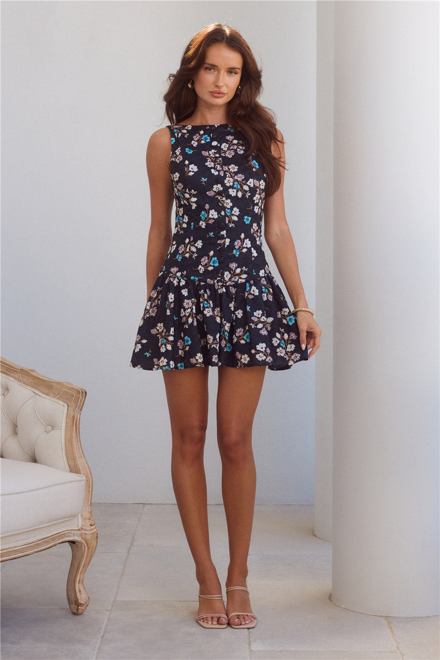 Isn't she lovely? The Love And Luxury Mini Dress features self-covered buttons. a floral printed design and a dropped waist. Style with heels for all the likes.