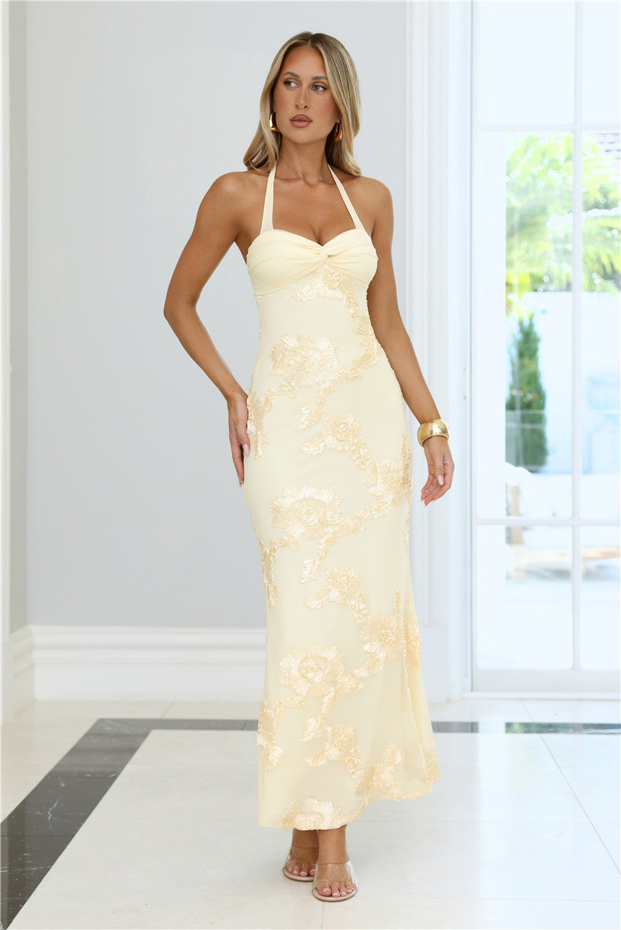 The Love Muse Halter Maxi Dress is your go-to for flirty. effortless elegance. Featuring a halter style with a twist neckline. delicate embroidered design. and a chic open back. this maxi dress is made to feel feminine and playful. Perfect for special occasions. garden parties. or any moment you want to turn heads with dreamy. confident vibes.