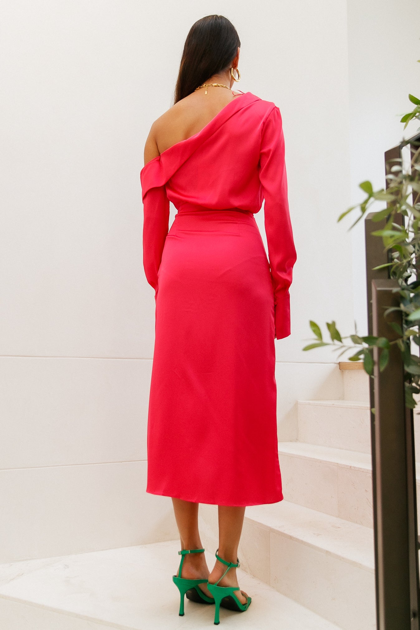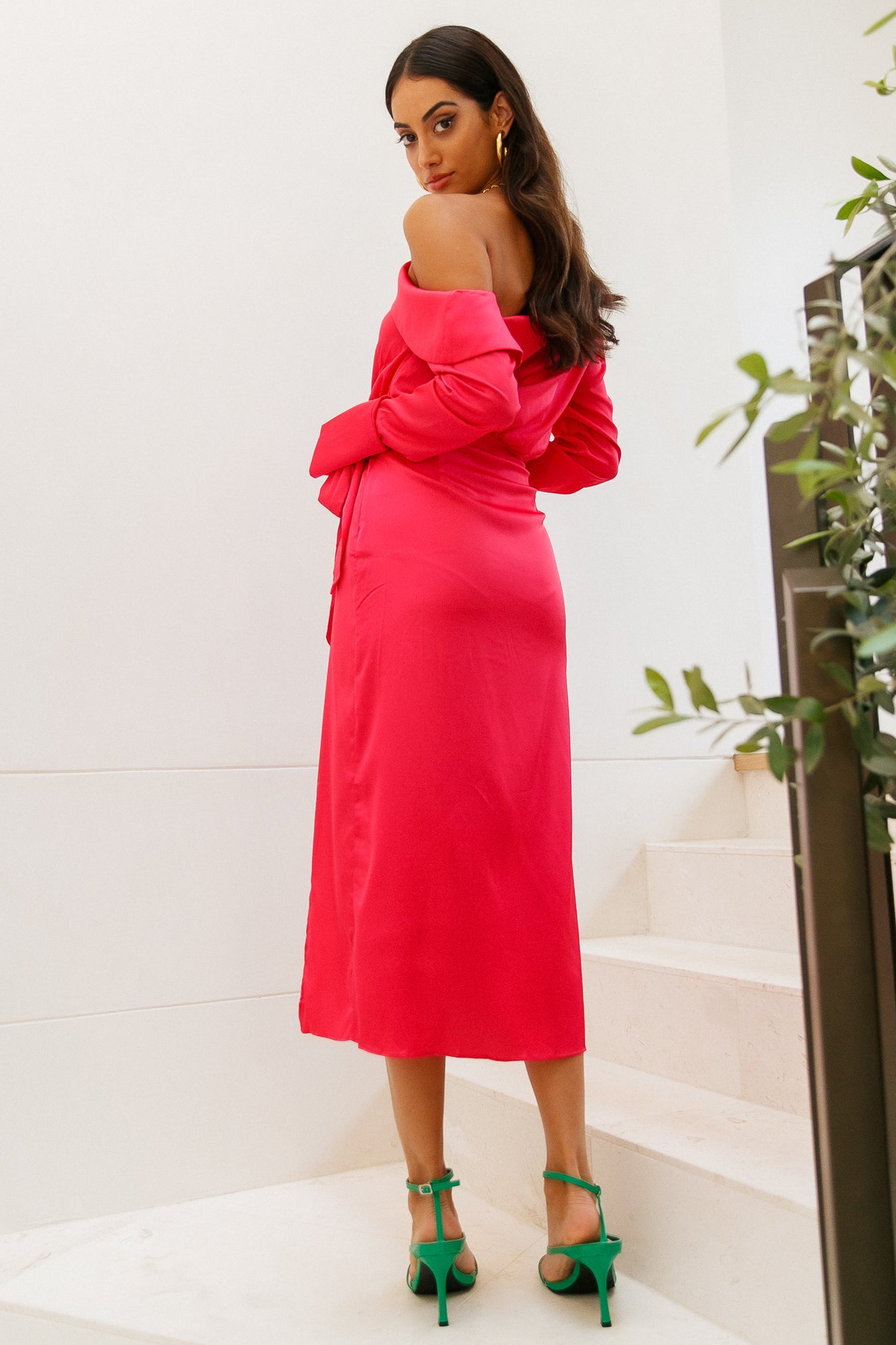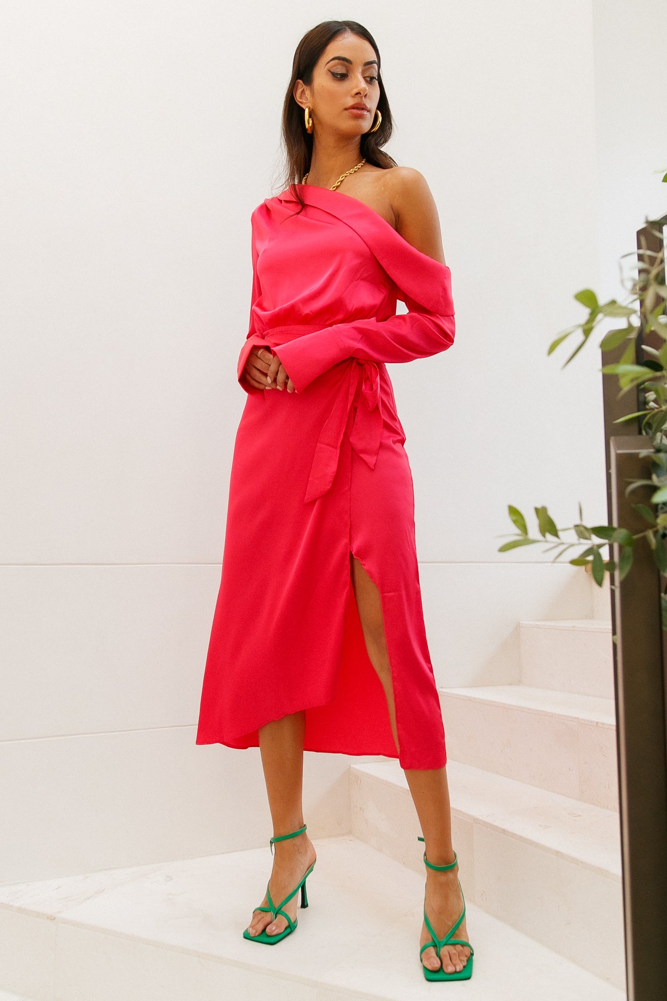 Fabulous. This one word encompasses your entire personality. so you deserve a dress that's as loud as you! Introducing the Love On Top Midi which features a slashed neckline with a foldover neckline. long sleeves. a wrap detail and an asymmetrical hemline. Style yours with an updo and a pink lip.
