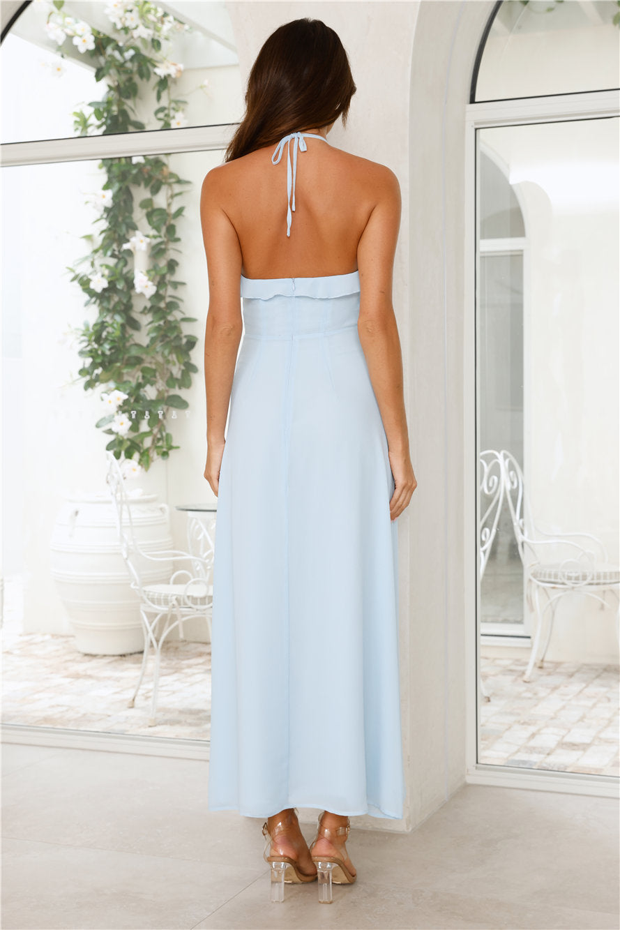 Feel effortlessly enchanting in the Love Potion Halter Maxi Dress. featuring a delicate halter tie. frill trim along the neckline. and flirty frill detailing at the skirt split for the perfect romantic touch! Style with heels.