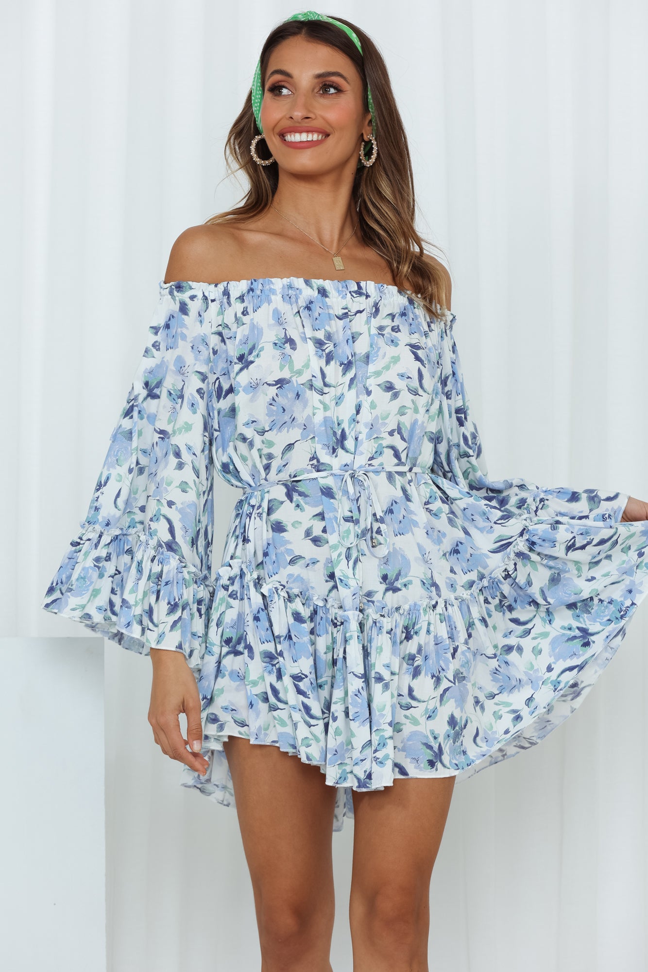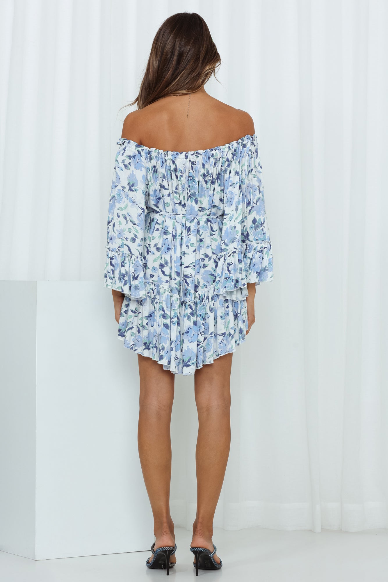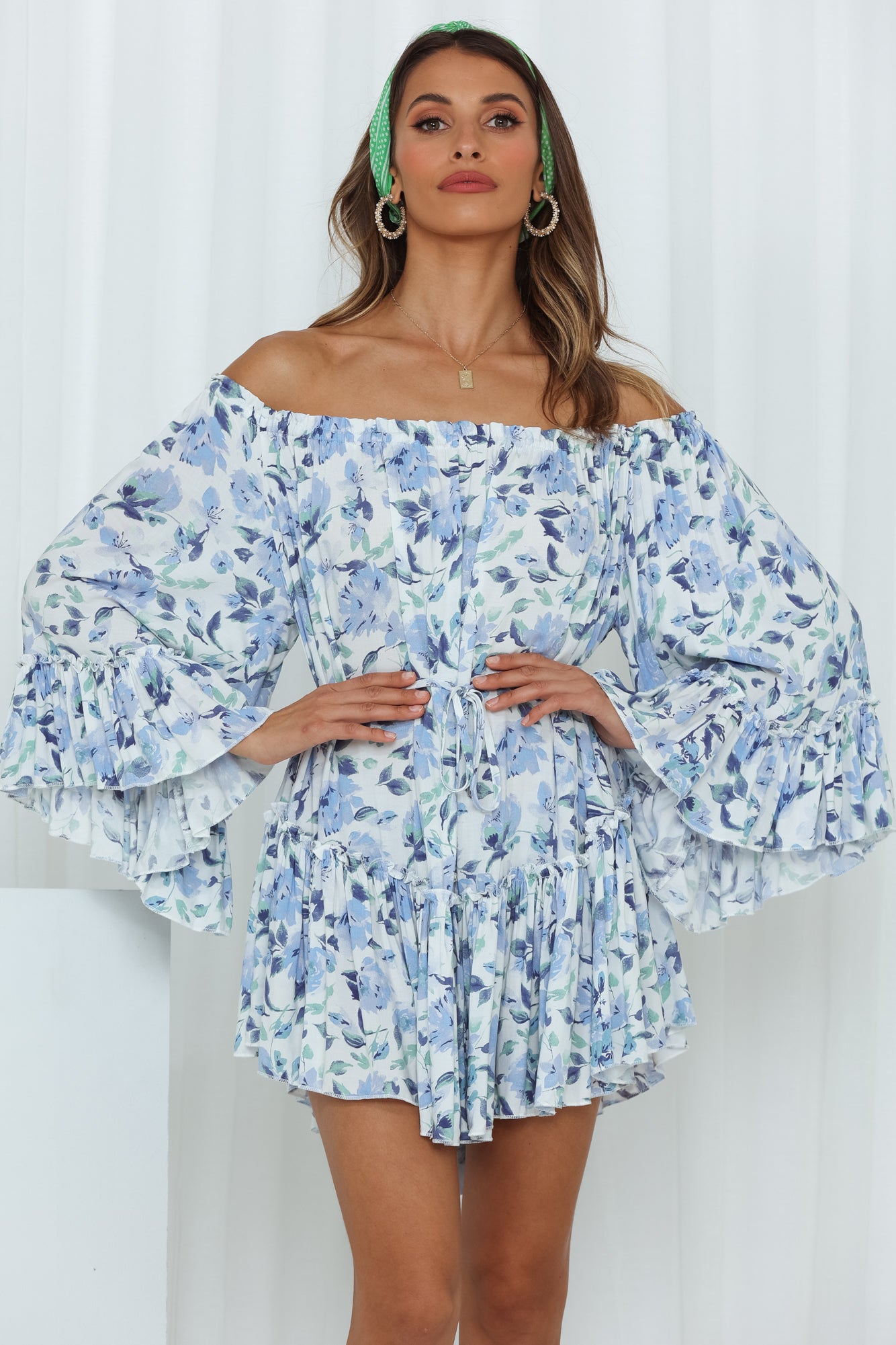 We Love The Way this is making you look. so cute! This mini has a unique billowy silhouette with waist-ties so you can be PEAK boho chic. Along with flowy short sleeves and the off the shoulder neckline - you'll be adorable all day long! Style yours with strappy heels and small pearl earrings.