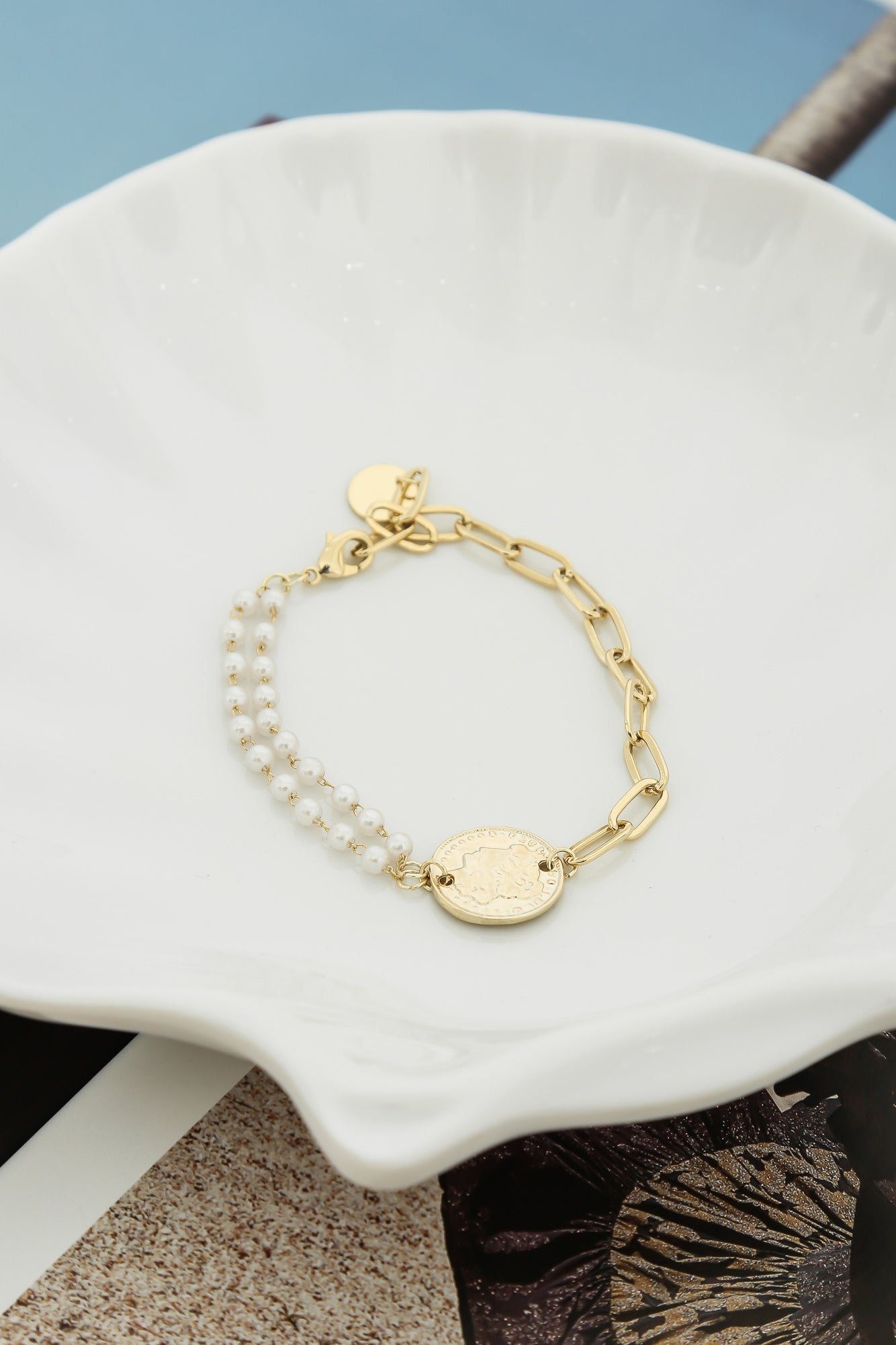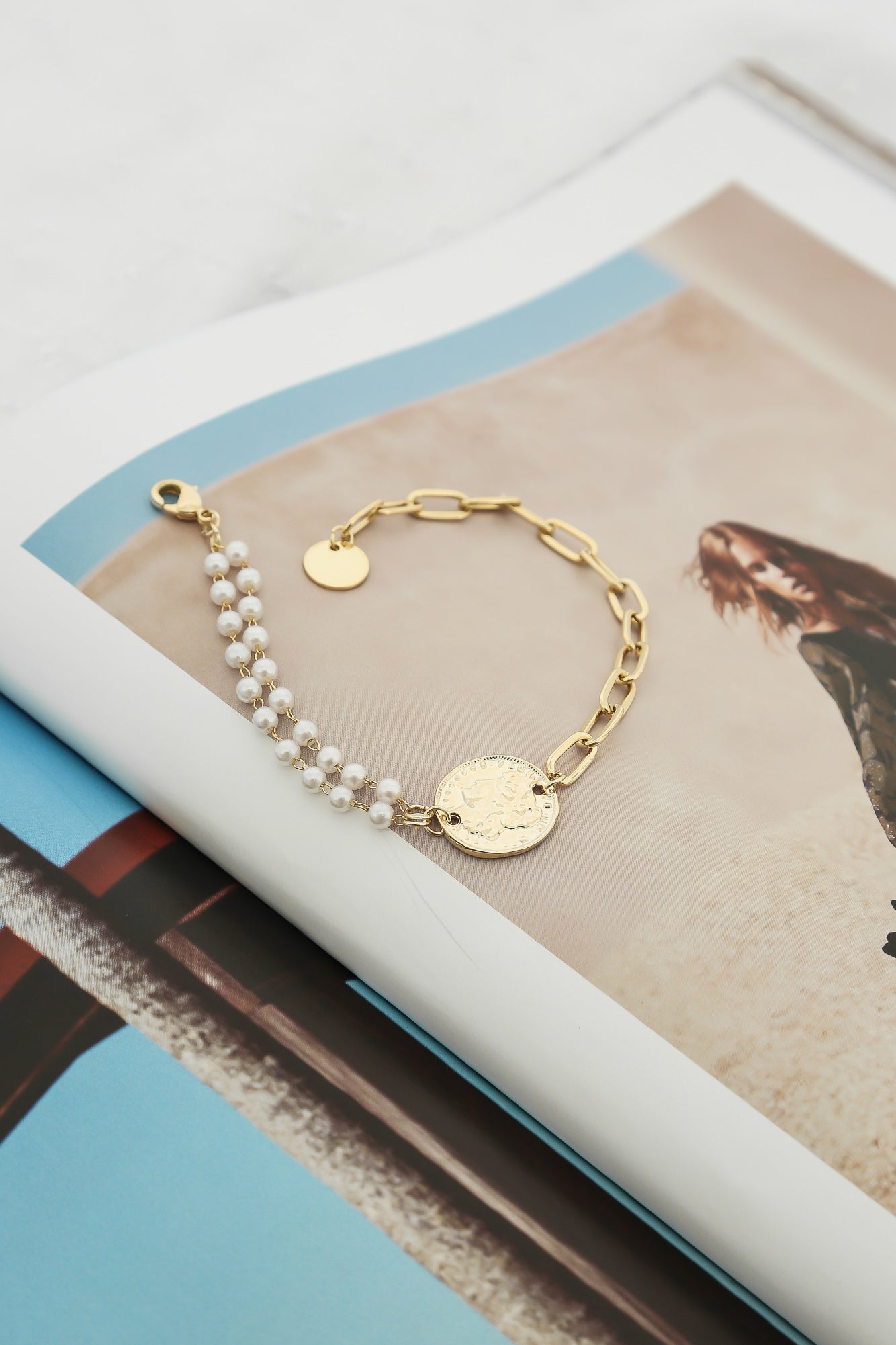 - Gold coin pendant bracelet.