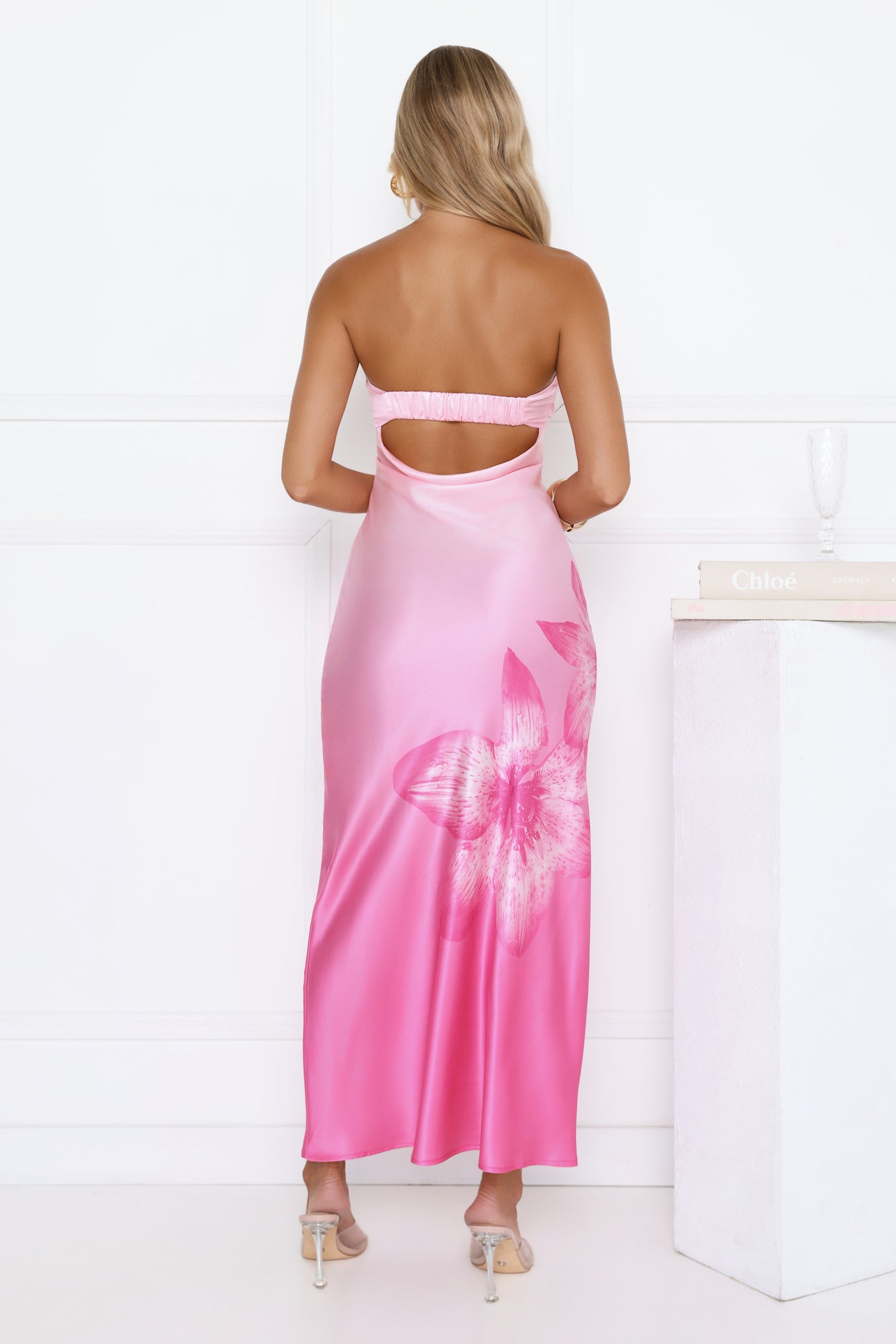 Turn heads and ignite your night in this stunning maxi dress. Featuring a chic strapless design. a playful backless cut. and a gorgeous floral print that blossoms across luxurious satin fabric. This gradient pink showstopper ensures all eyes are on you. Complete your dazzling look with clear heels. delicate gold jewelry. and a sleek clutch for an unforgettable entrance at your next event.
