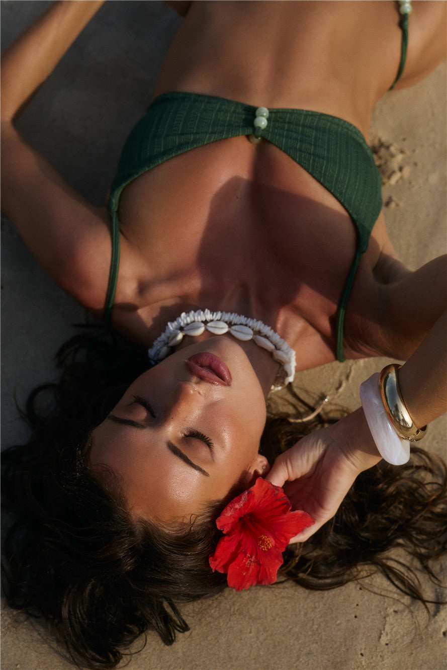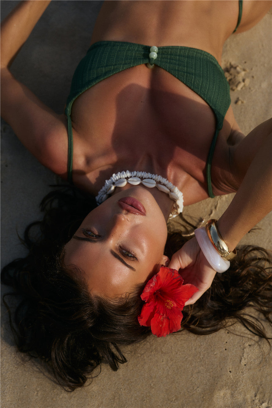 Dive into tropical vibes with the Lush Tide Swim Top. Crafted from stretchy. swim jersey that's quick-drying. it features a flattering scoop neck. tie-up back detail for an adjustable fit. and delicate beaded accents for a touch of sun-kissed glam. Pair it with matching swim bottoms for the ultimate summer-ready look.