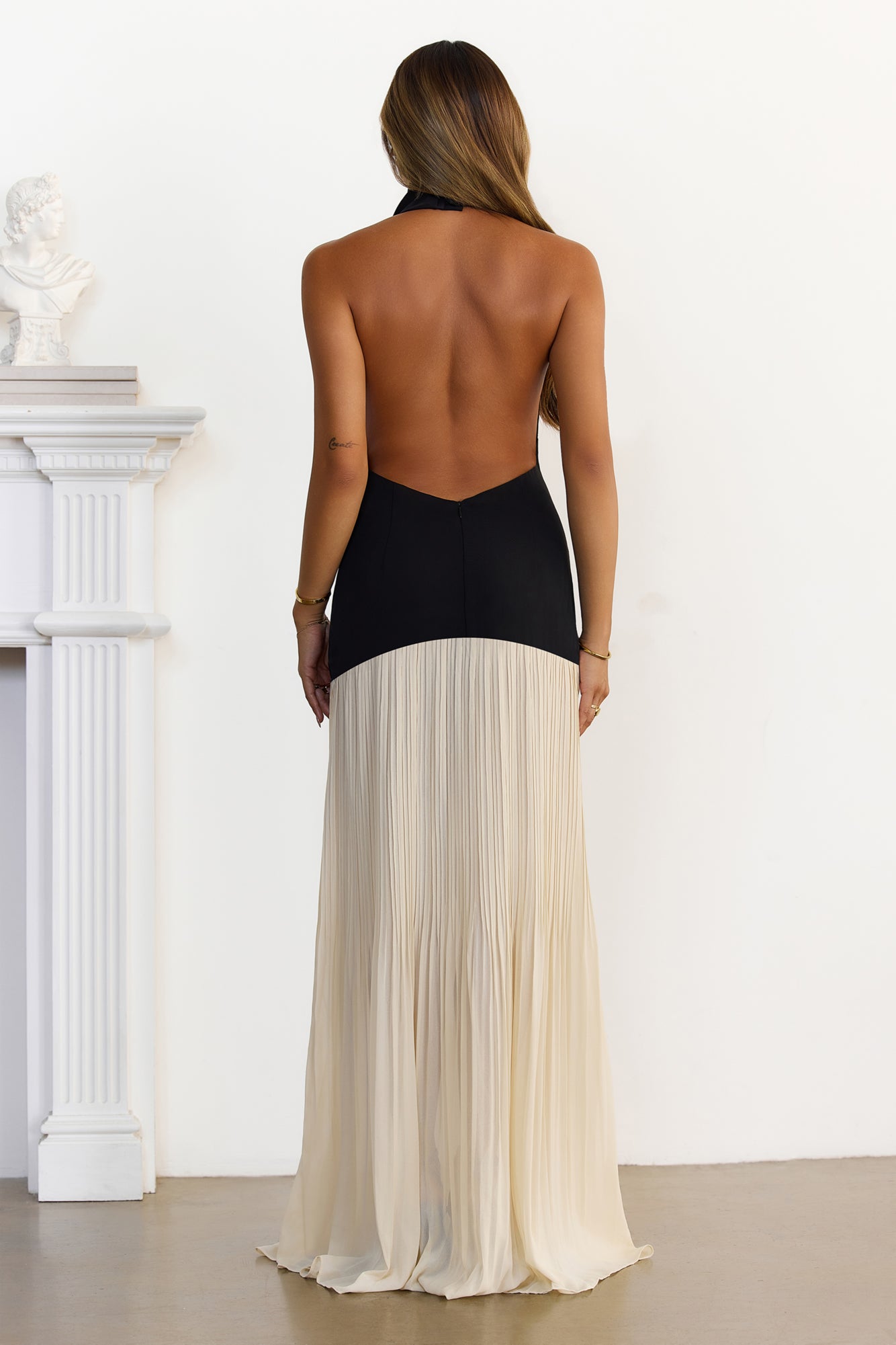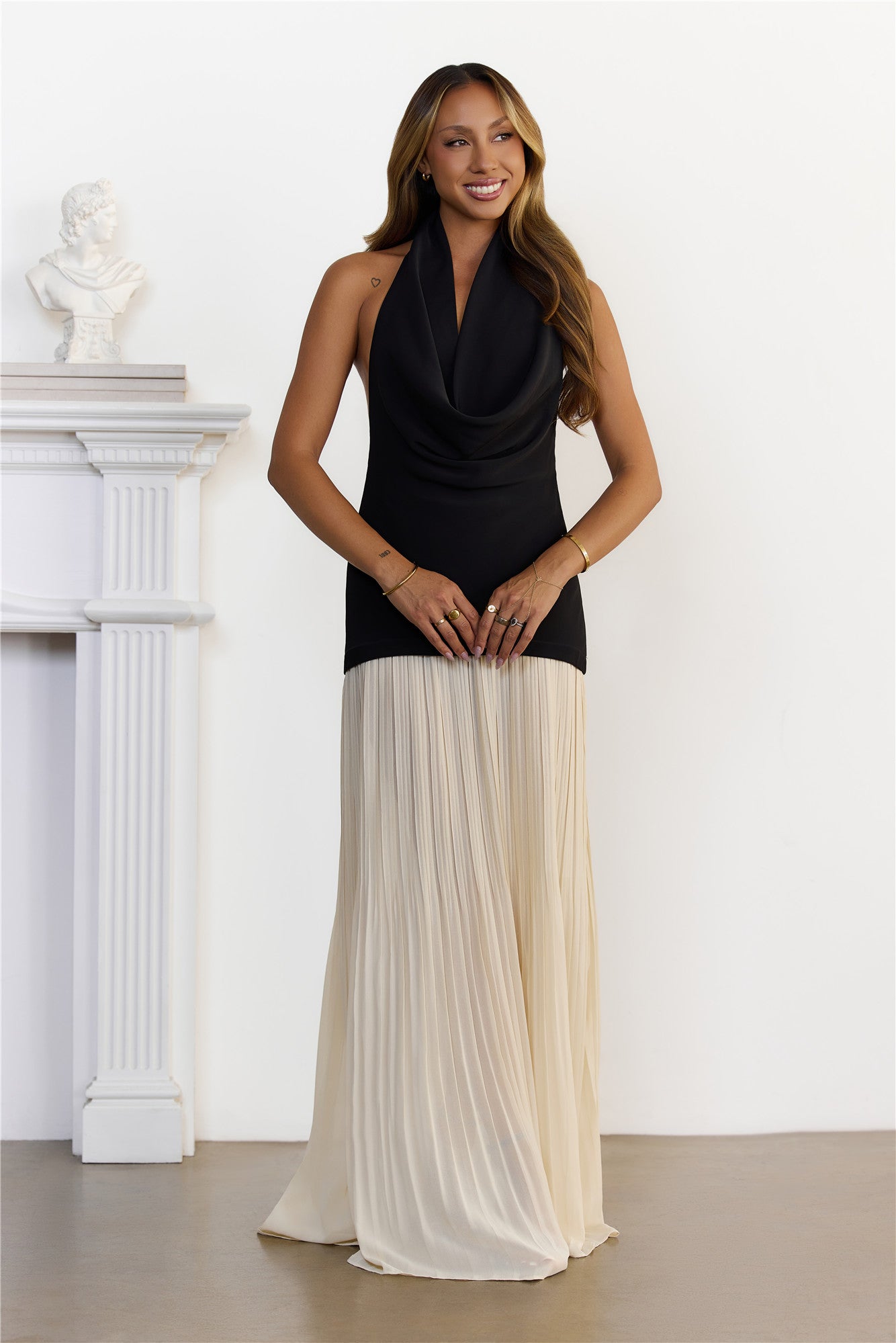 Turn heads in this stunning piece! Featuring a sultry halter neckline with a chic cowl neck drape. an alluring backless design. and a contrasting pleated maxi skirt for ultimate elegance. Perfect for making a memorable entrance wherever you go. Style with strappy heels. a delicate clutch. and statement earrings for an unforgettable evening look.