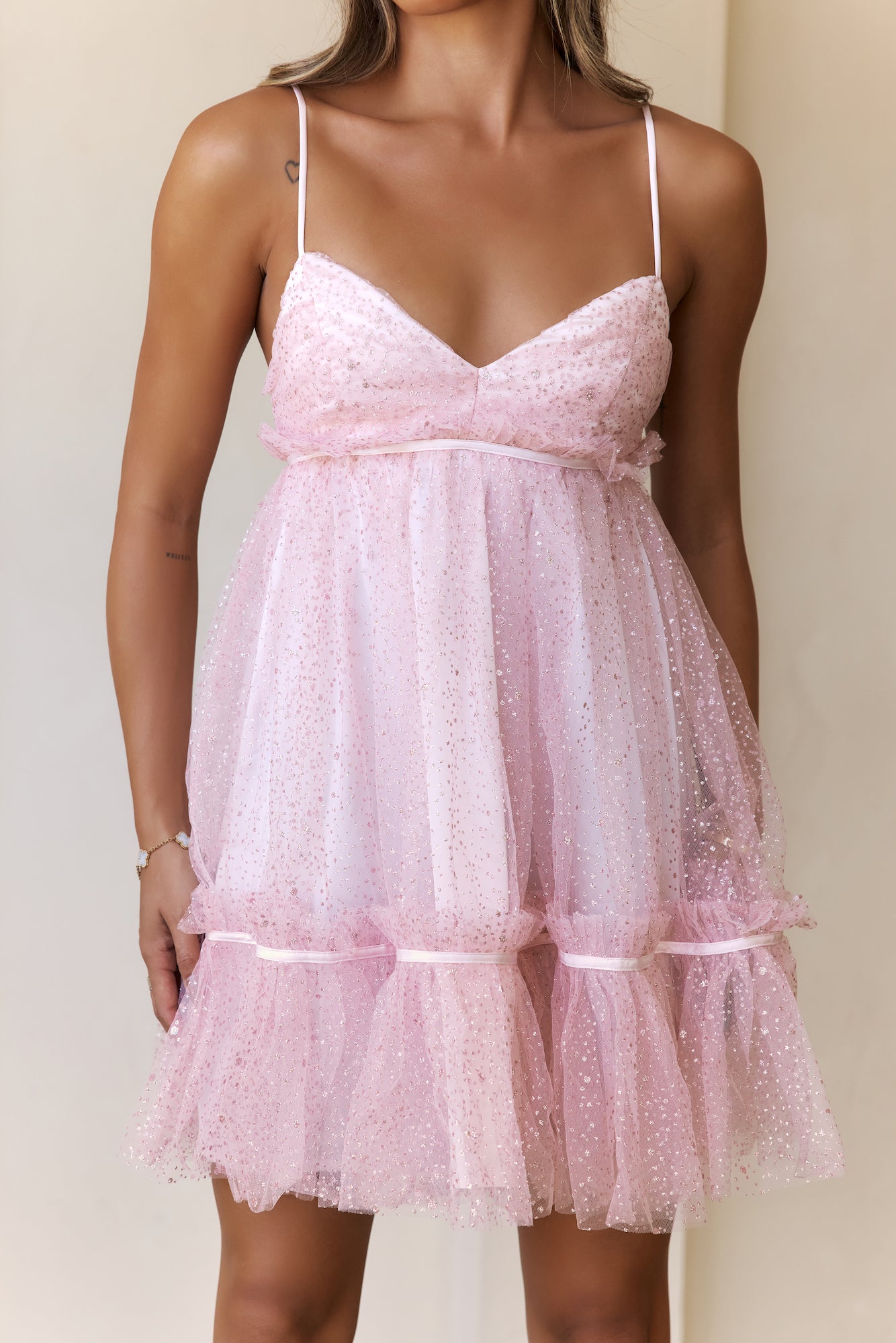 You deserve a dazzling entrance. lovely. The Luxe Enchantment Glitter Mini Dress features a gathered skirt. fine tulle with glitter detail and a flowy silhouette. Style with heels for all the attention.