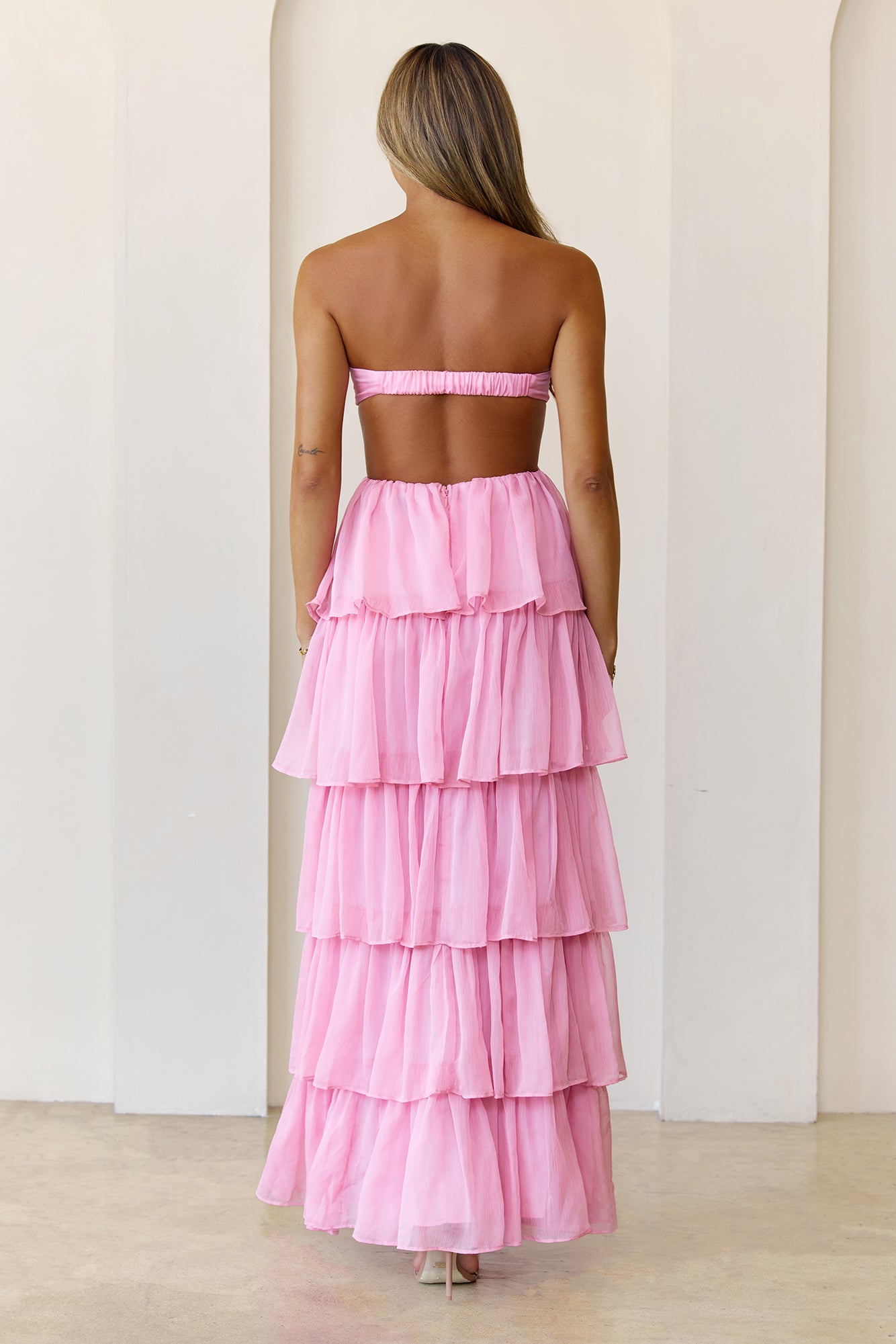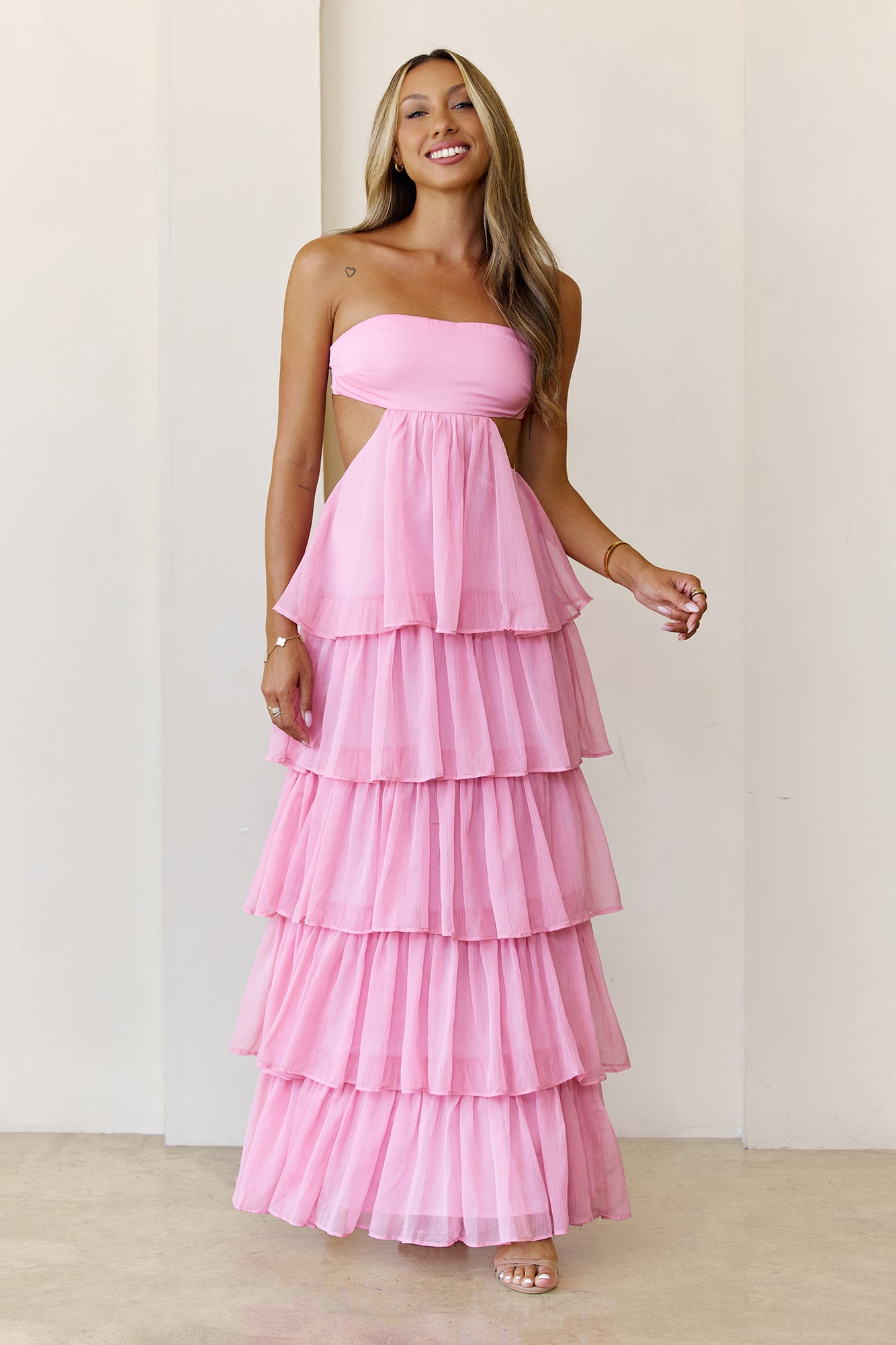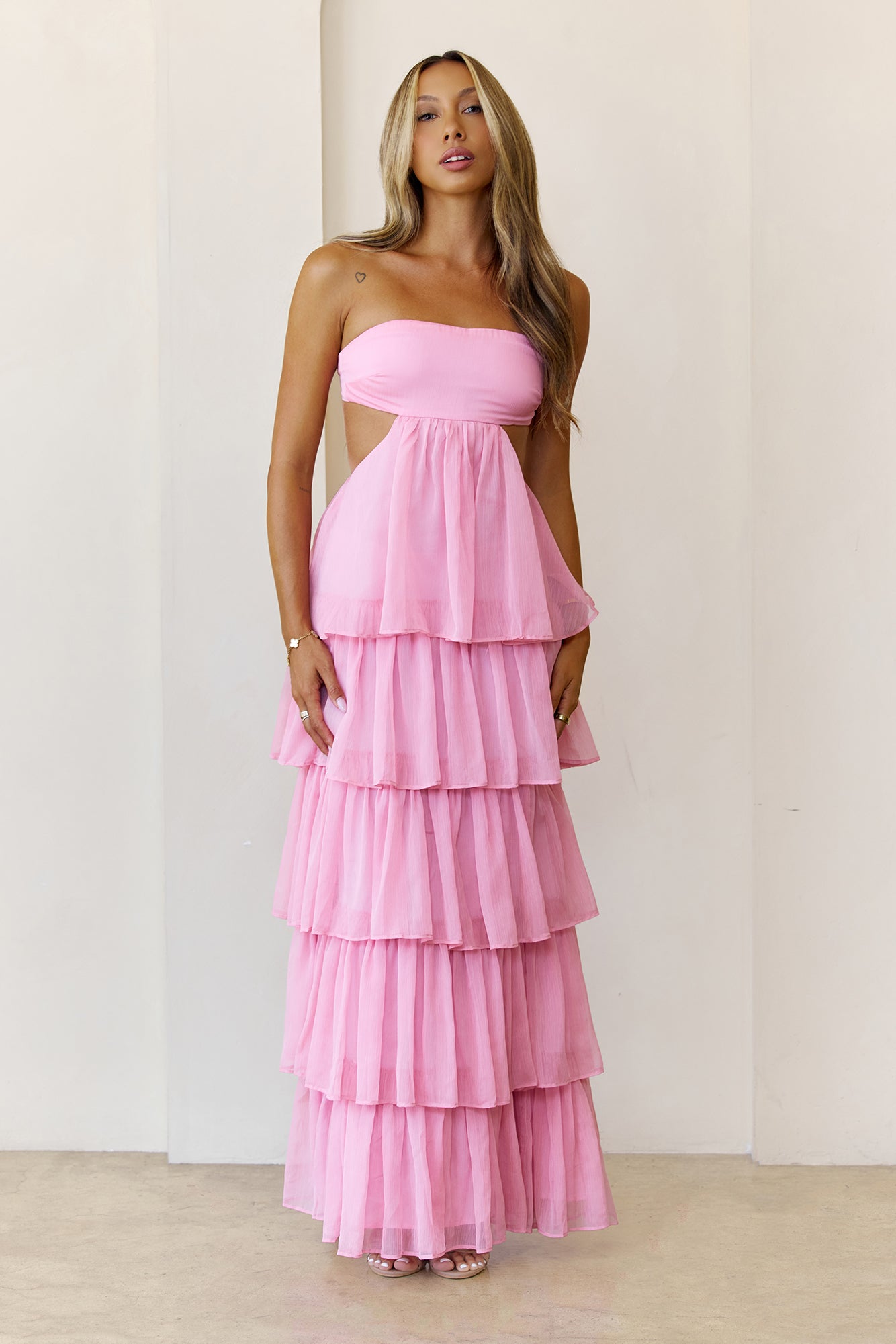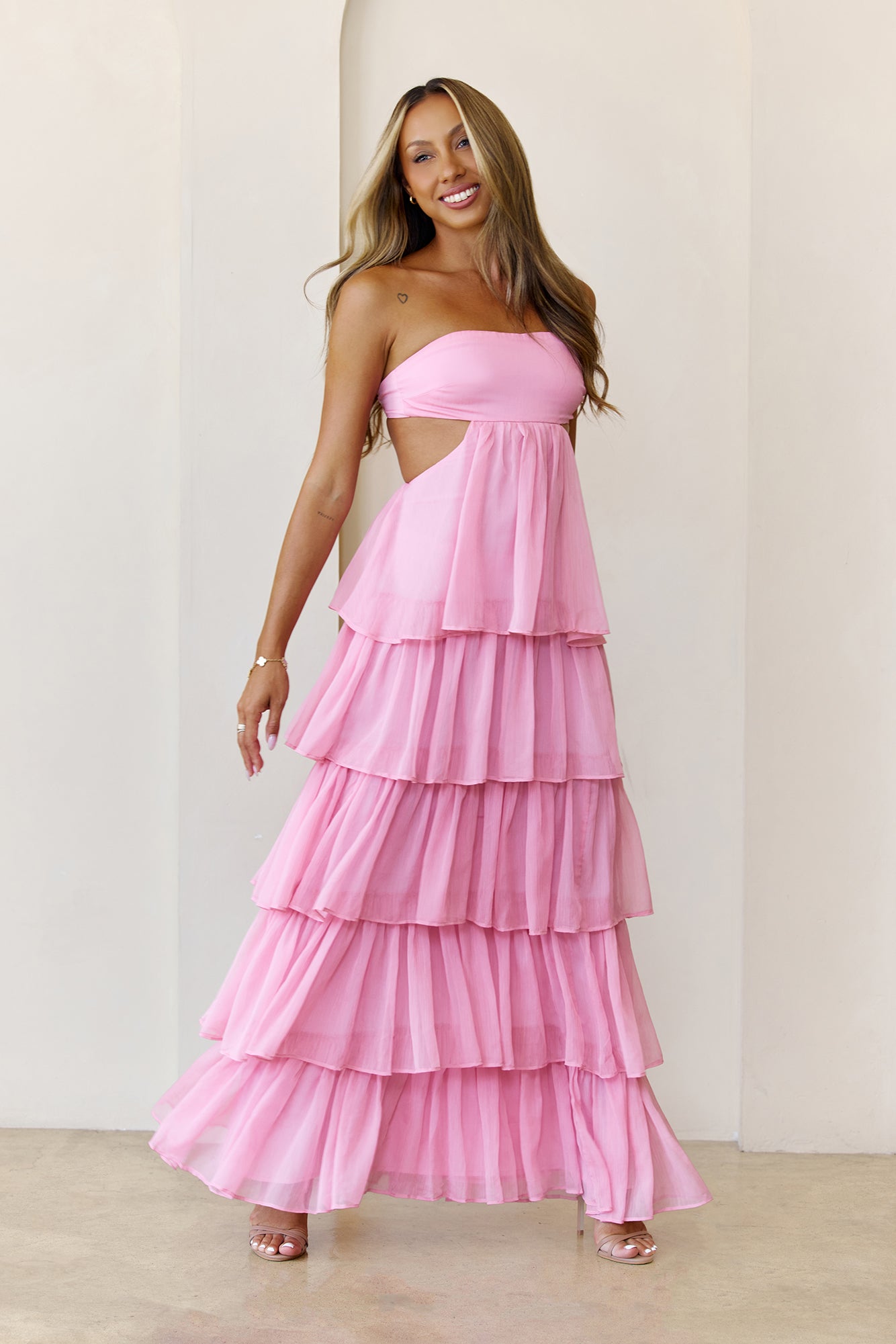 Set the style standards in the Luxe Mode Strapless Maxi Dress. It features an elastic back. a cutout to the waist and a tiered frill skirt. Style with heels and curls.