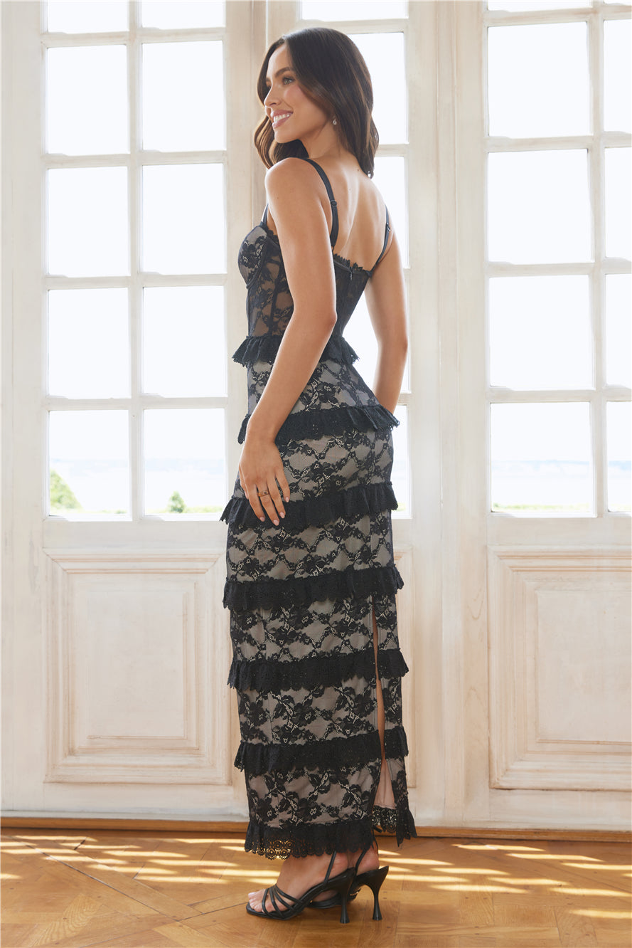 For an unforgettable. elegant look. choose the Luxe Mystique Lace Maxi Dress. It features a sheer lace bodice. embroidered tiered frills. nude-coloured lining and padded cups. This dress is sure to turn heads and leave a lasting impression. Style with heels.