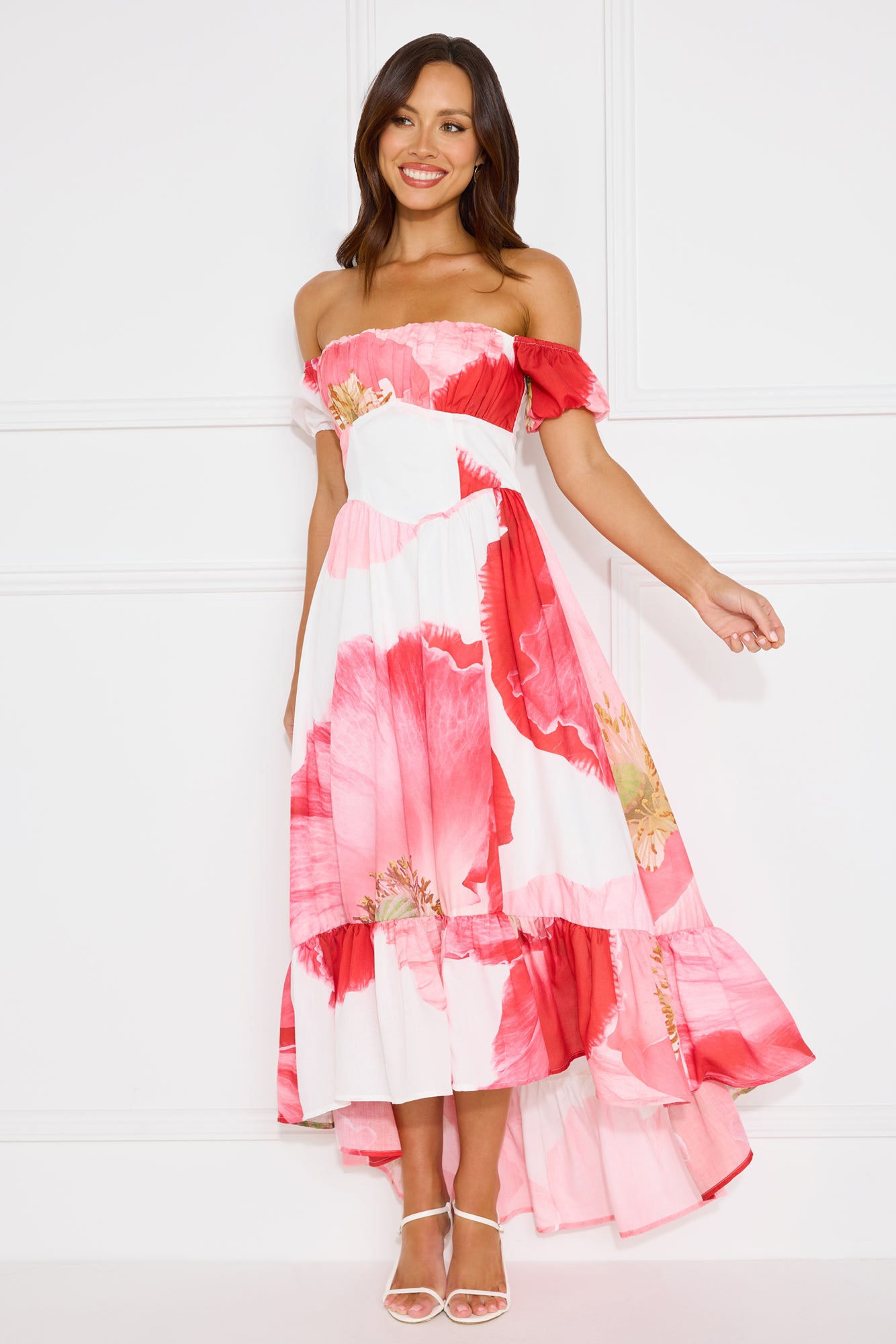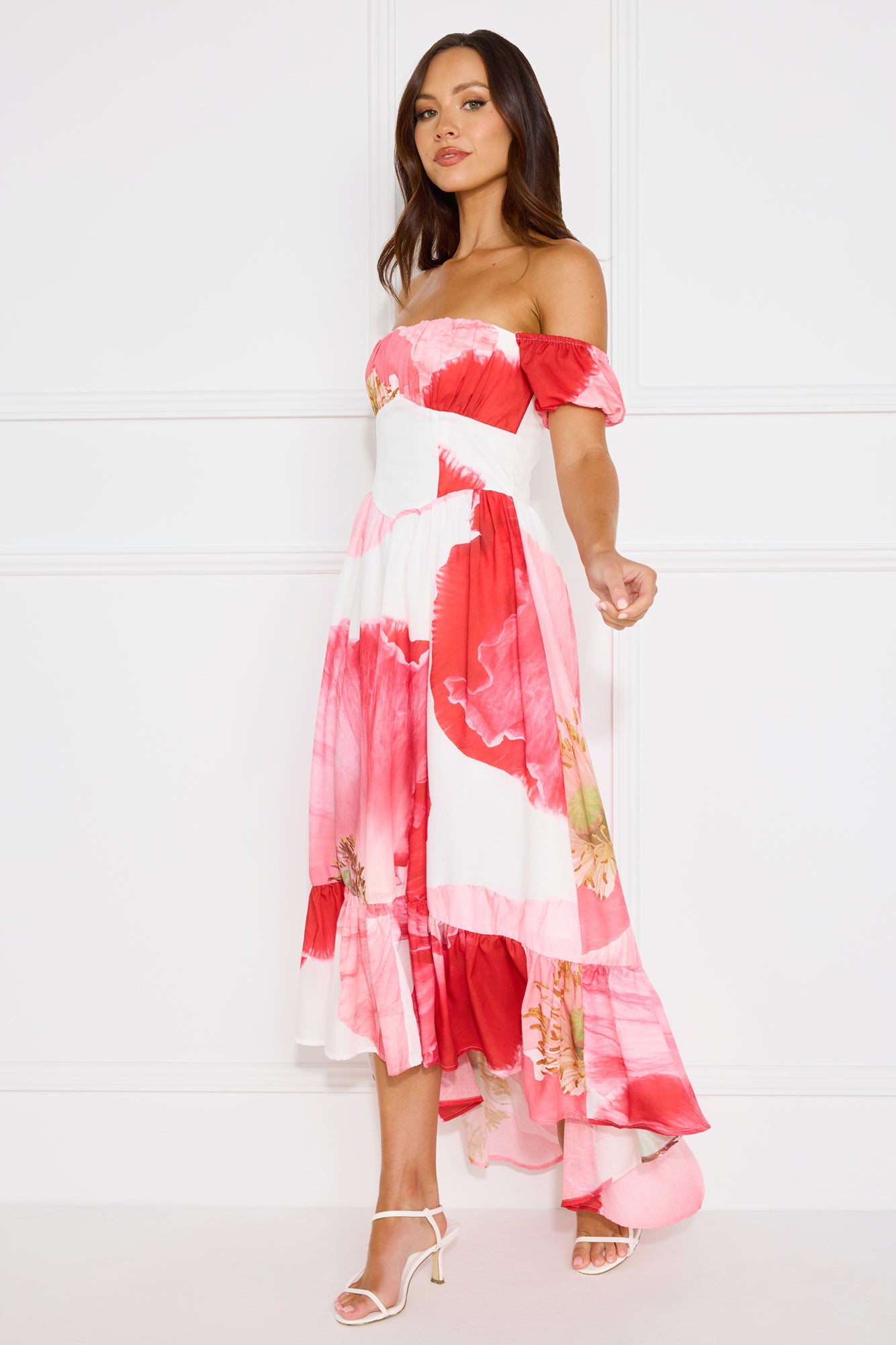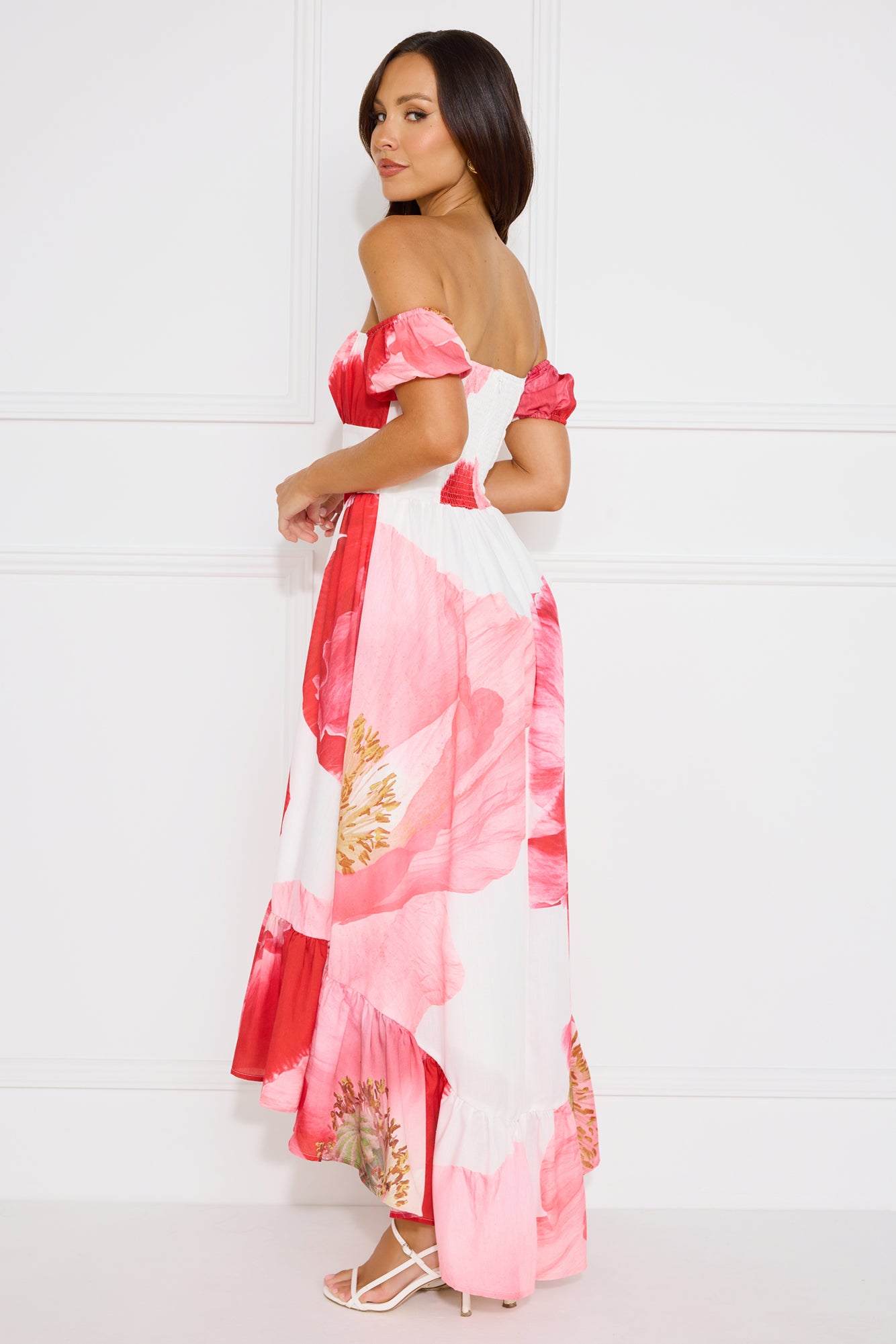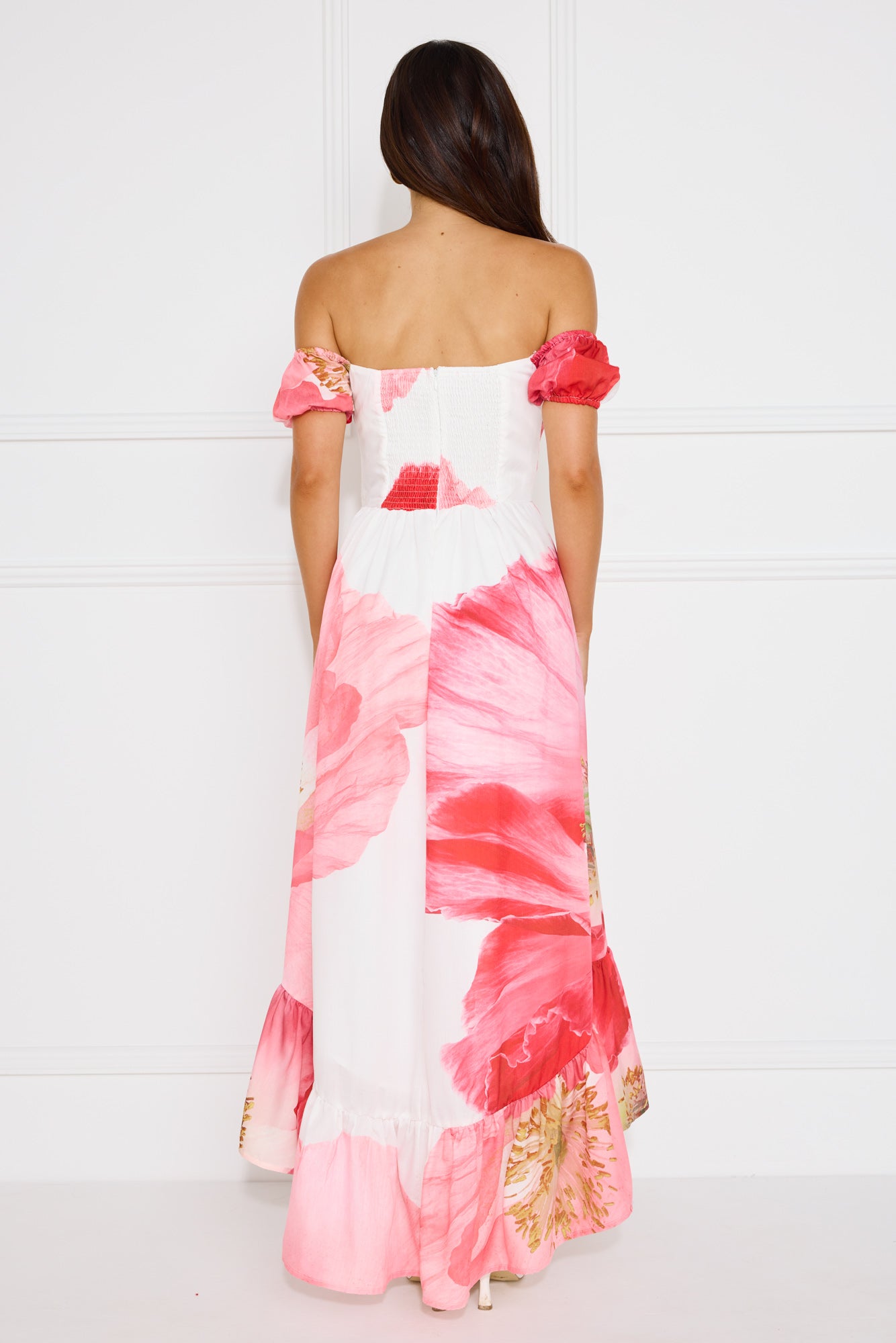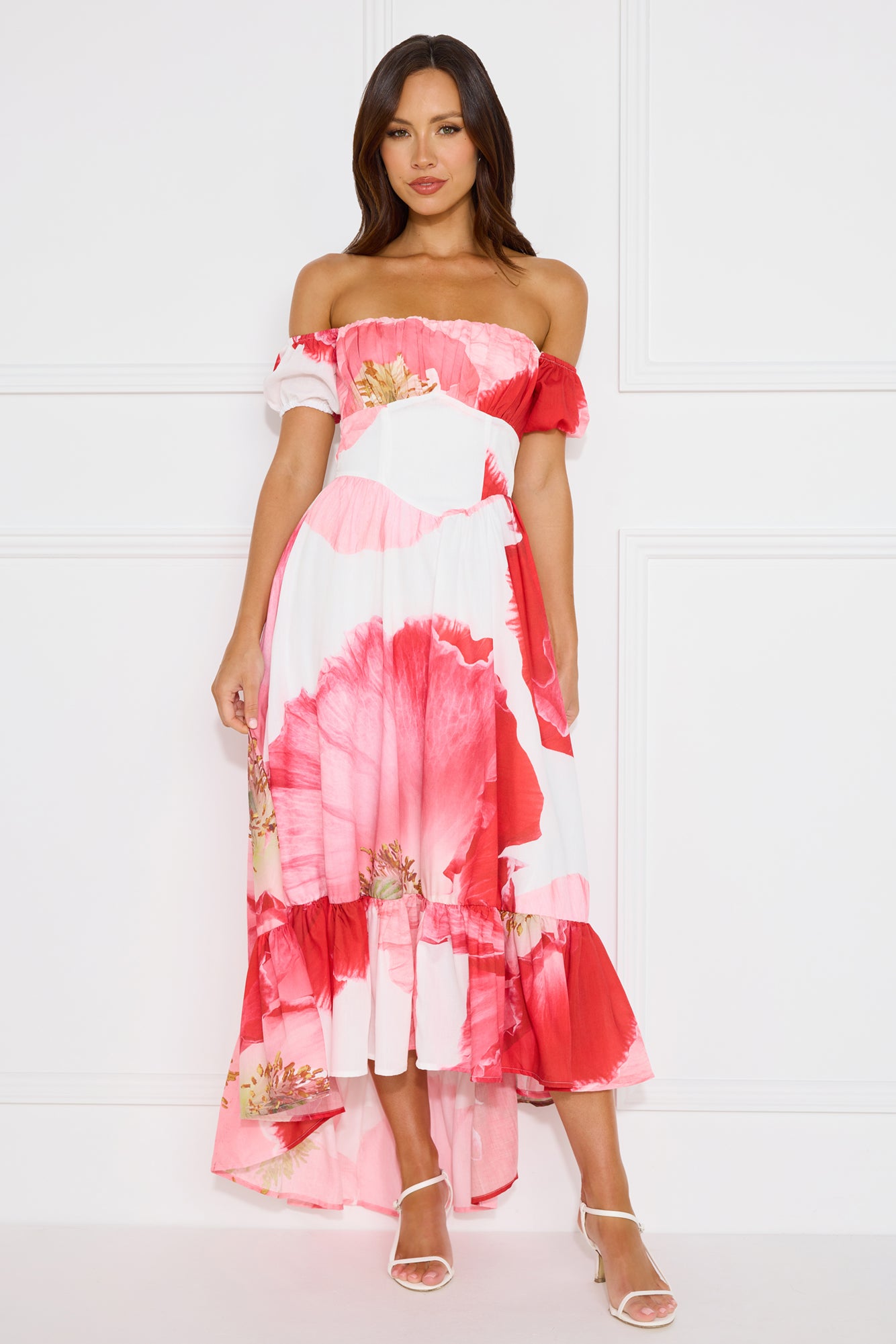 We're in love with the Luxe Narrative Off Shoulder Maxi Dress. Featuring elastic sleeves. a high-low skirt and an elastic back. Style with heels to impress.