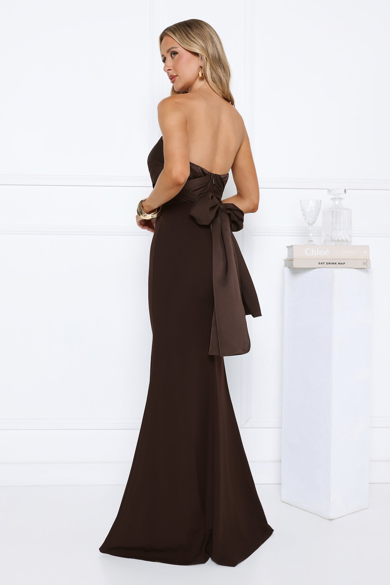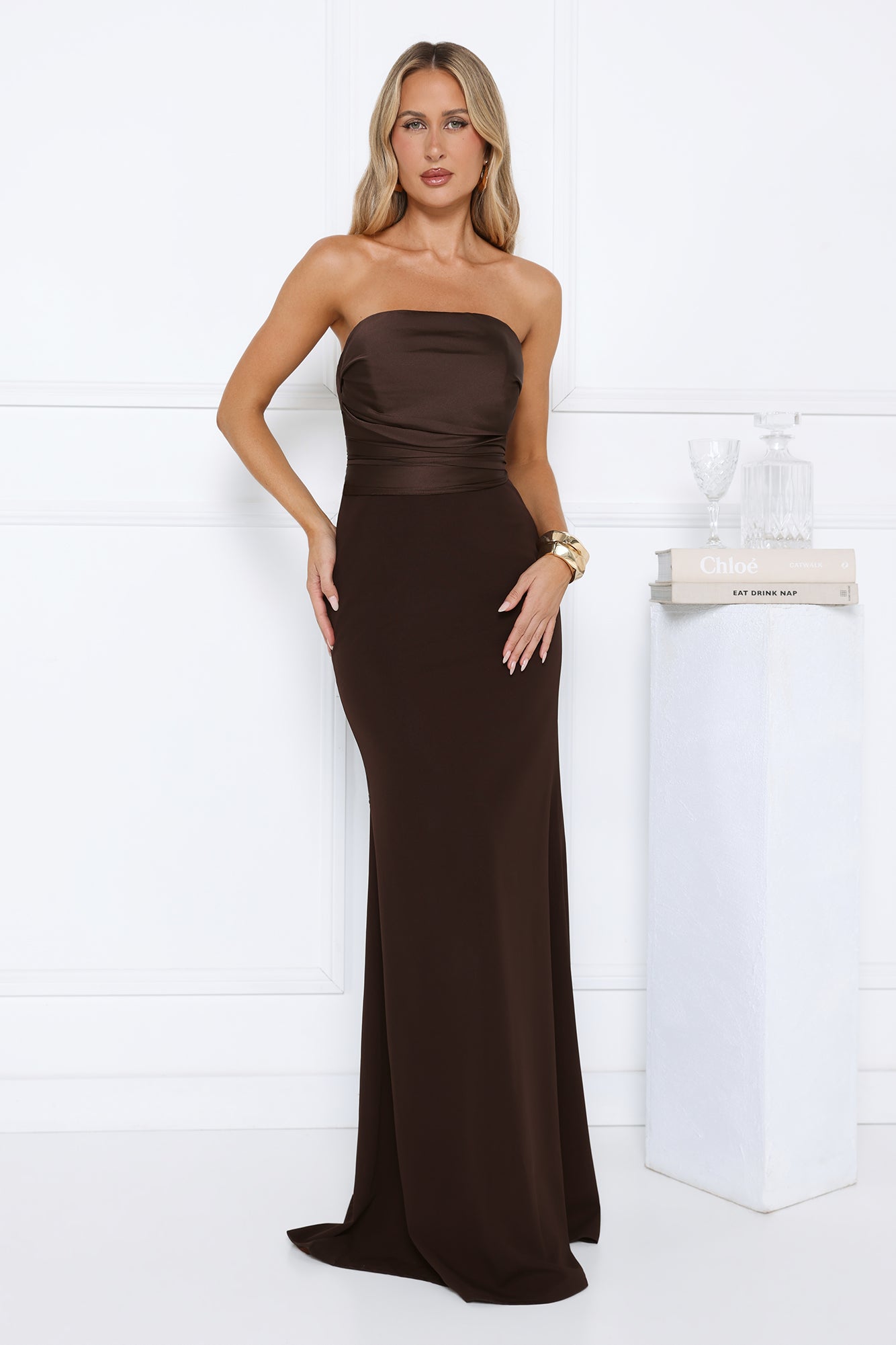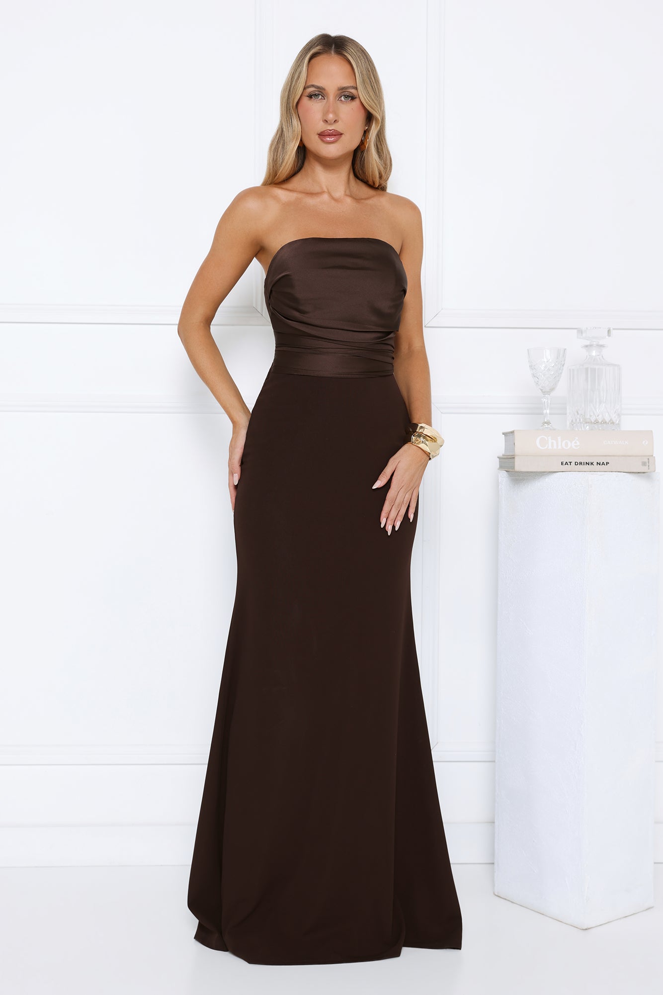 Make a statement in the Luxe Nights Strapless Maxi Dress. Featuring a strapless neckline and flowing maxi silhouette. this dress is effortlessly chic and perfect for evening occasions. The satin tie to the back can be styled multiple ways for added versatility and elegance. Style it with strappy heels and a sleek clutch for a polished night-out look.