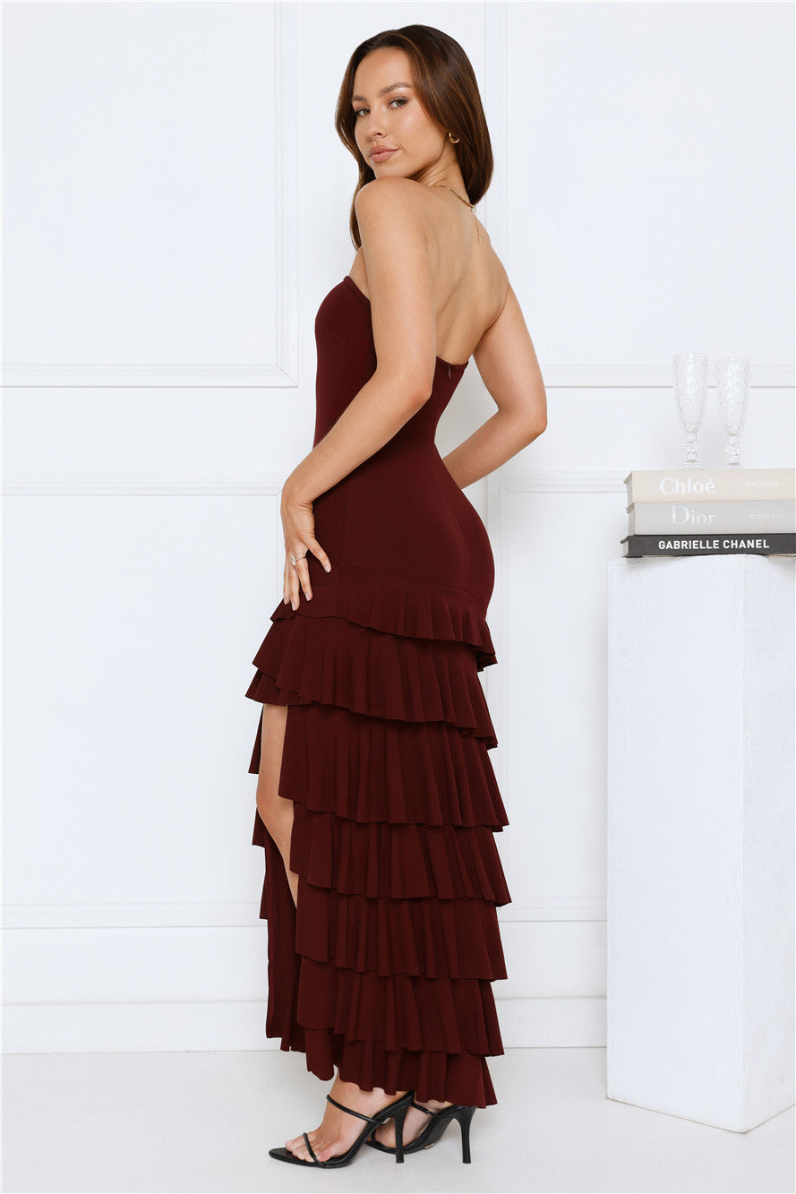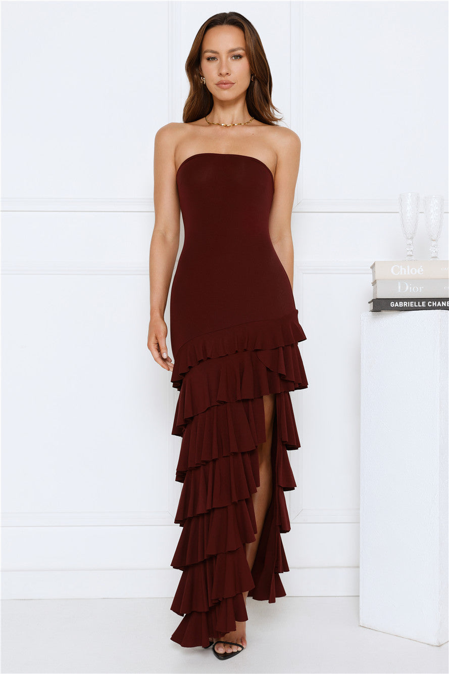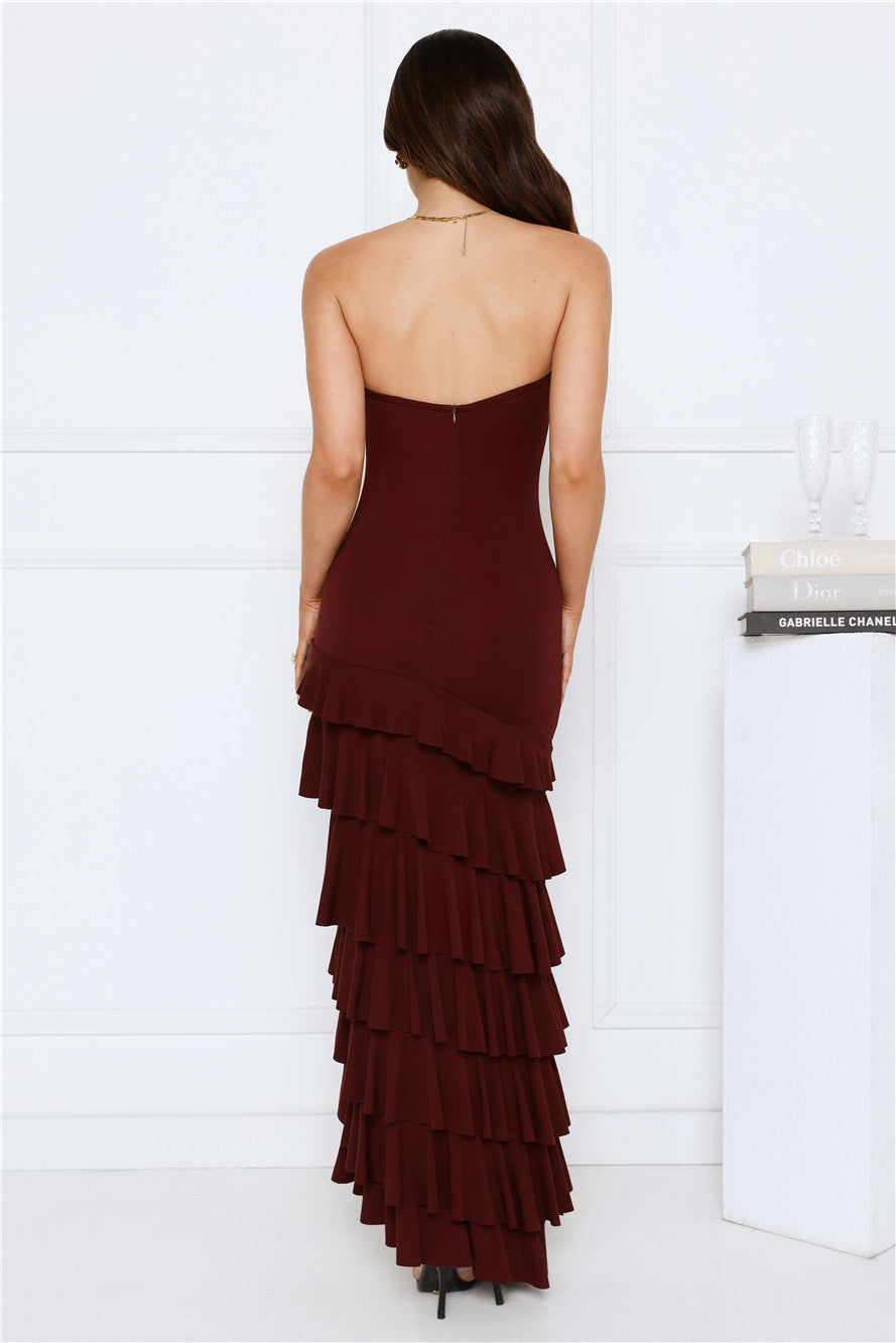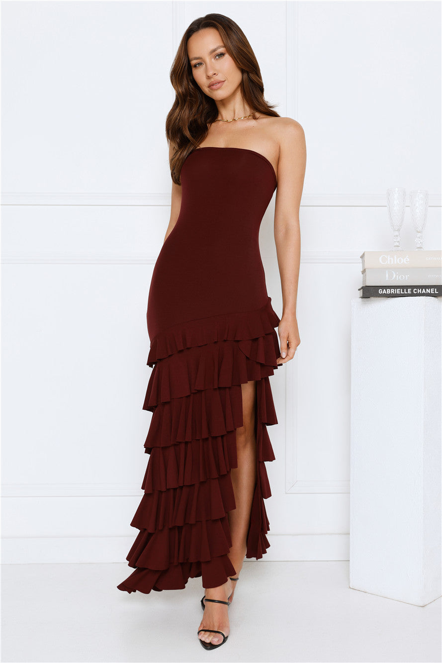 Make a statement in the Luxe Reflections Strapless Maxi Dress. featuring stretch fabric and a tiered frill hem—ideal for elegant evenings or sophisticated events.