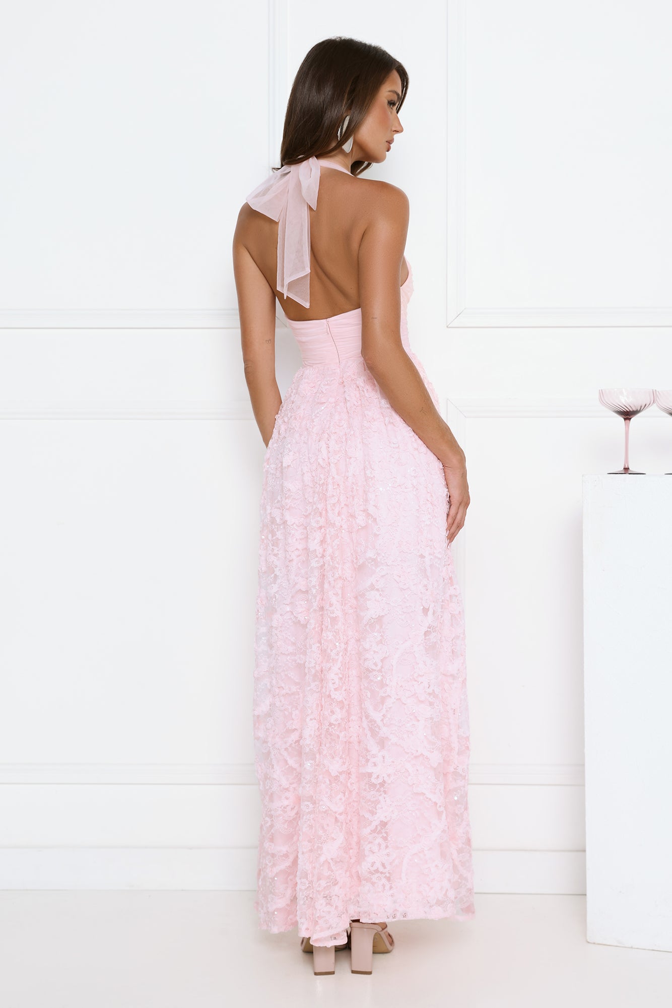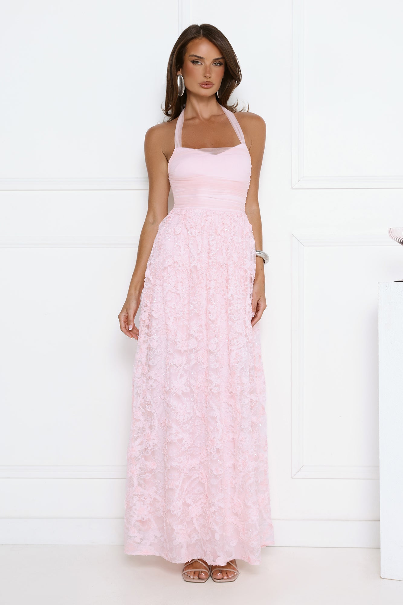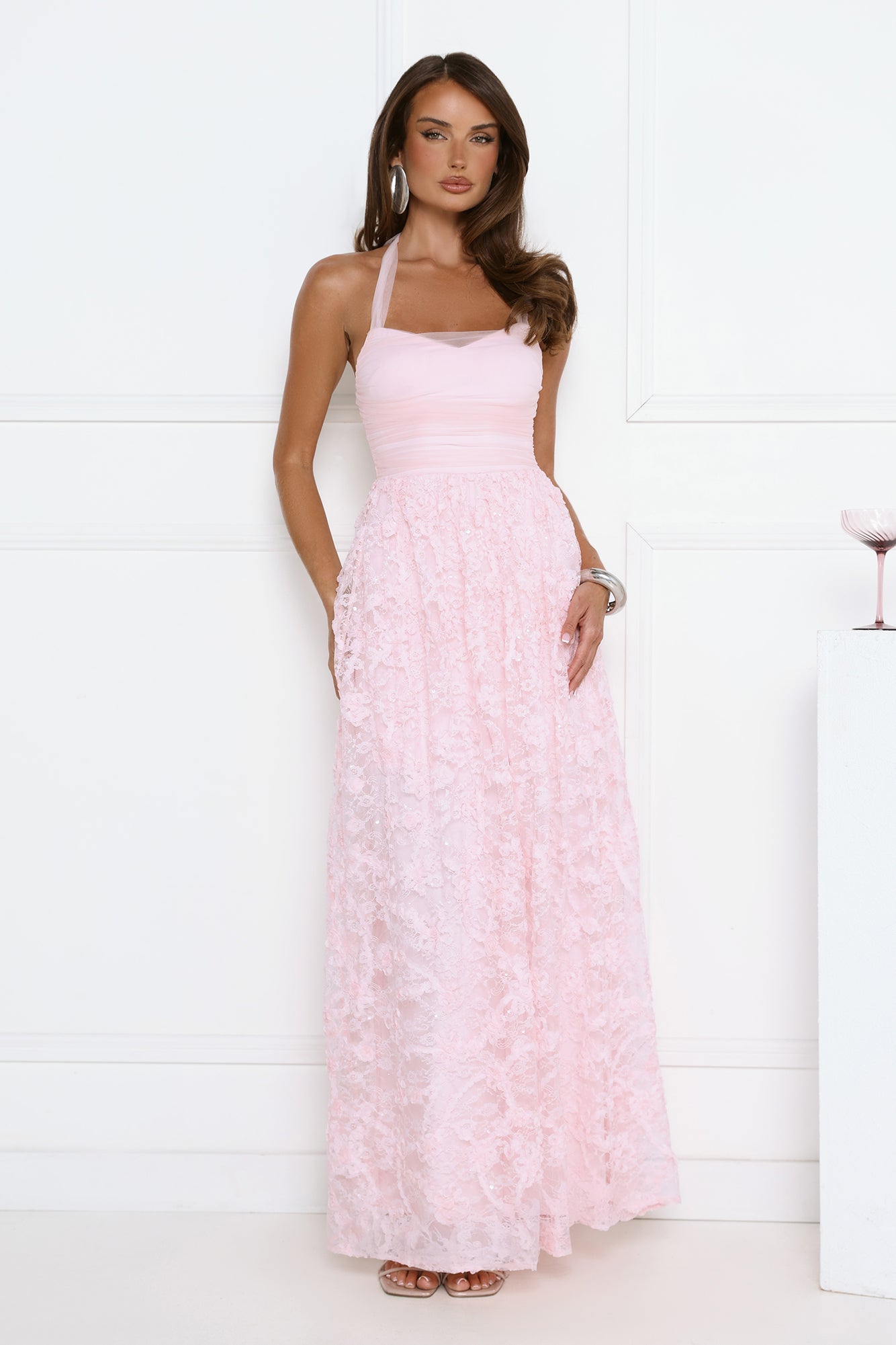 Step into soft. statement glam with the Magnetic Luxe Halter Maxi Dress. Featuring a halter neckline with a delicate mesh top. subtle sequin detailing. and a lace skirt that flows beautifully. this maxi creates an effortlessly feminine silhouette. Elegant and eye-catching. it's the perfect choice for special occasions. formal events. and unforgettable evenings.