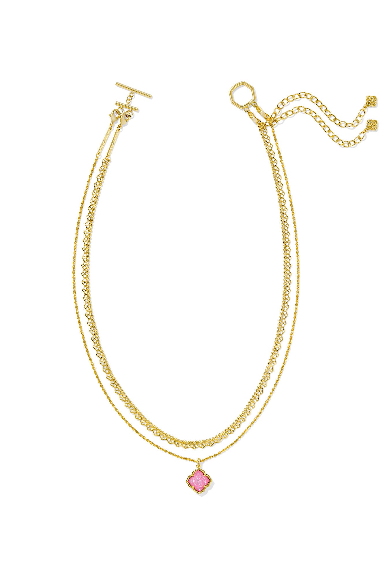 Your next favorite necklace stack is layered up for you with the Mallory Rose Gold Multi Strand Necklace. A rose pendant inspired by our signature medallion logo serves as the focal point of this necklace. perfectly paired with a lace-inspired chain. to give your look a subtle touch of elegance and romantic radiance. Styling tip: Keep the sculptural floral vibes going by pairing this necklace with the Mallory Rose Huggie Earrings.