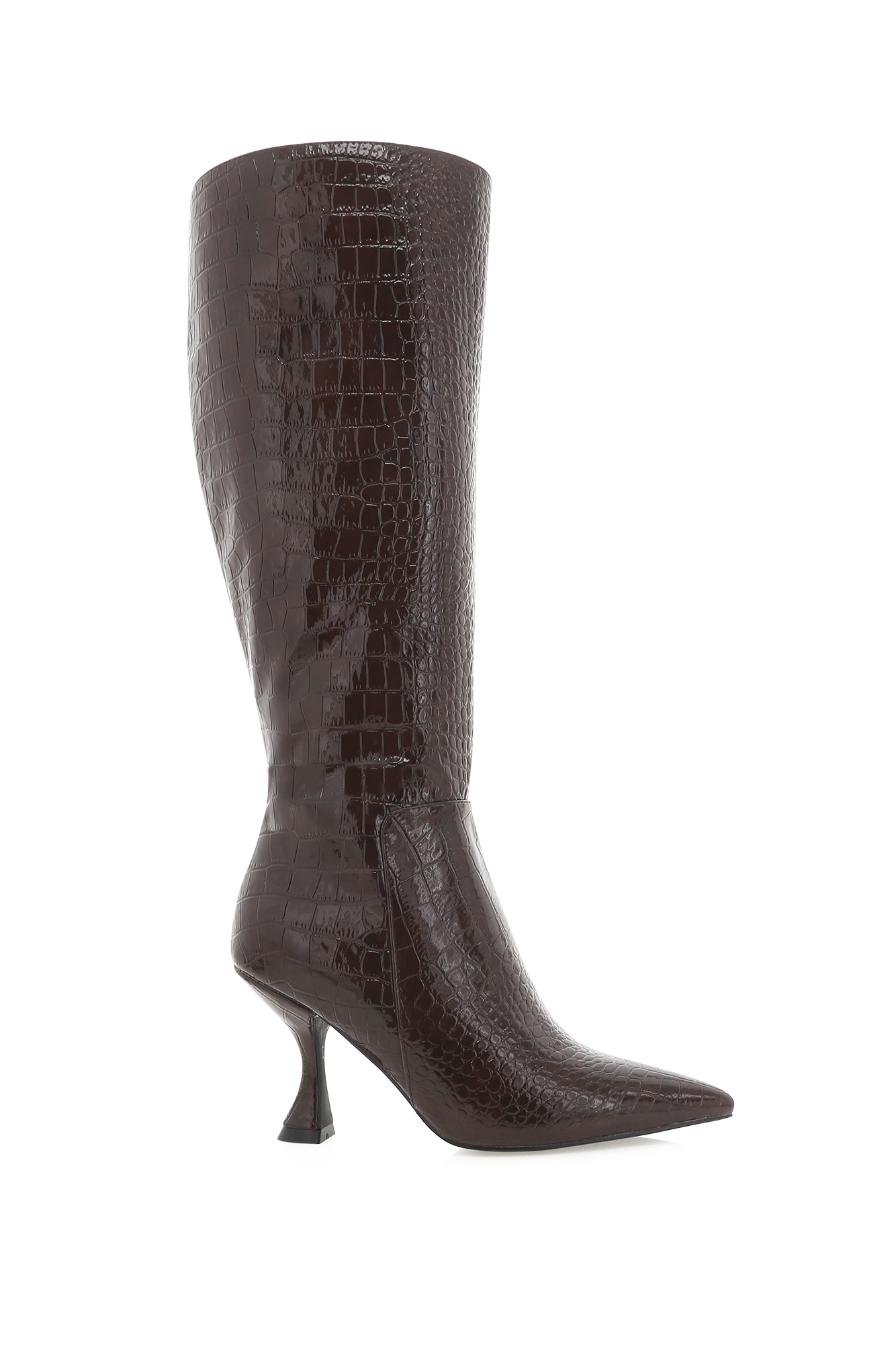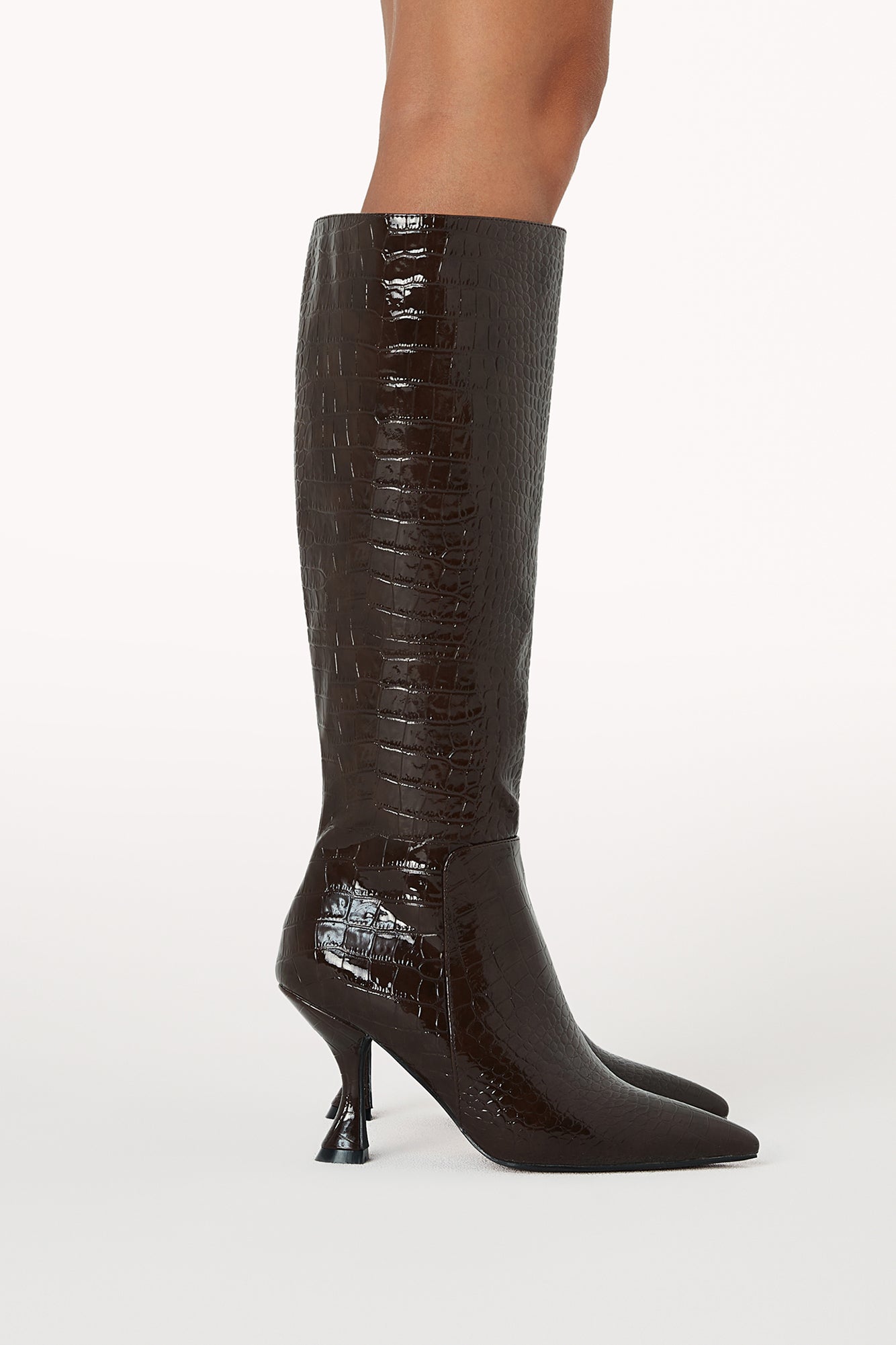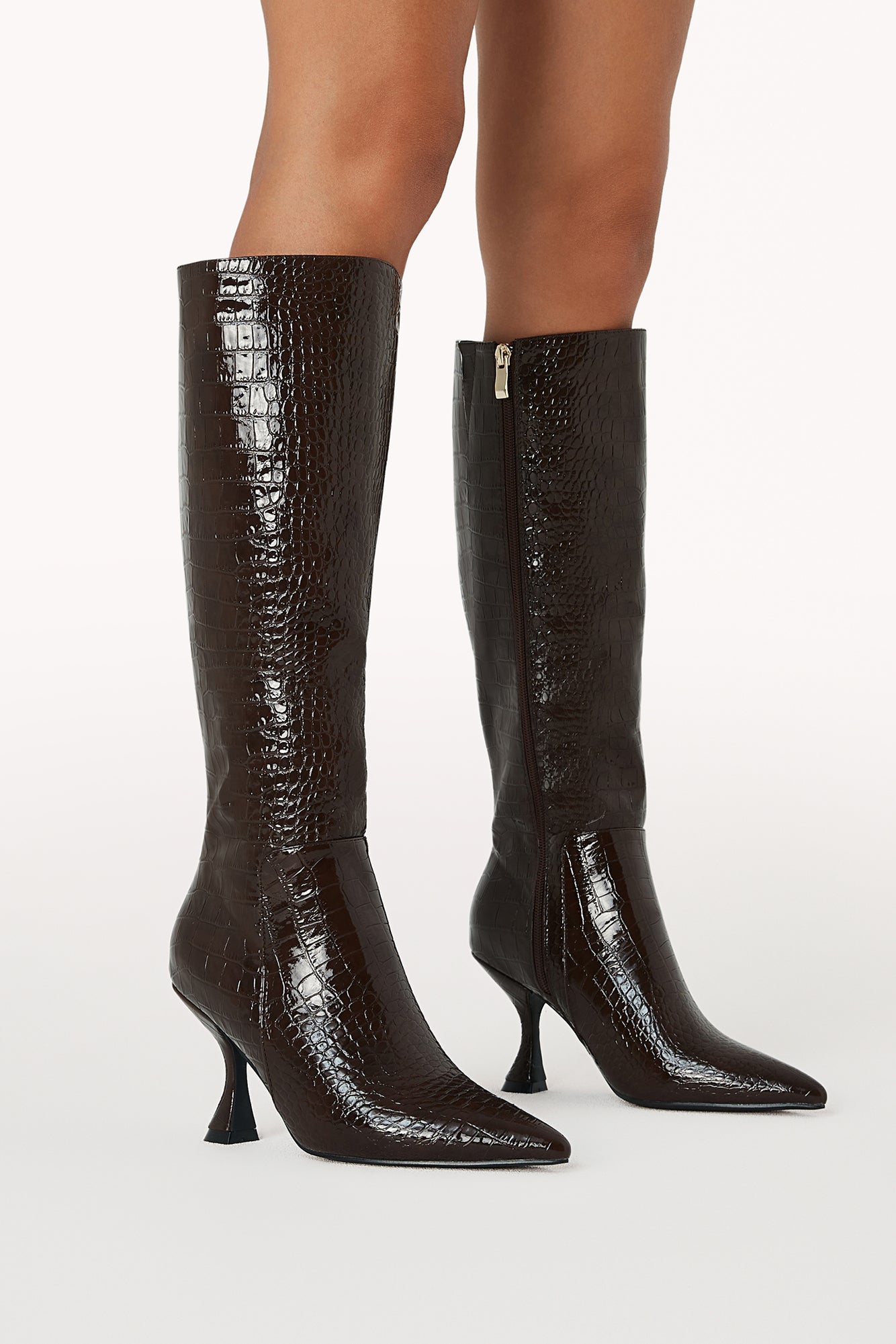 Step out in style with the Margaret Boots. Crafted with a chic croc print and a pointed toe. these knee-high boots feature a 3.5" sculpted heel for a flattering lift. Perfect for elevating dresses. skirts. or tailored pants. they're a statement piece for any fashion-forward wardrobe.