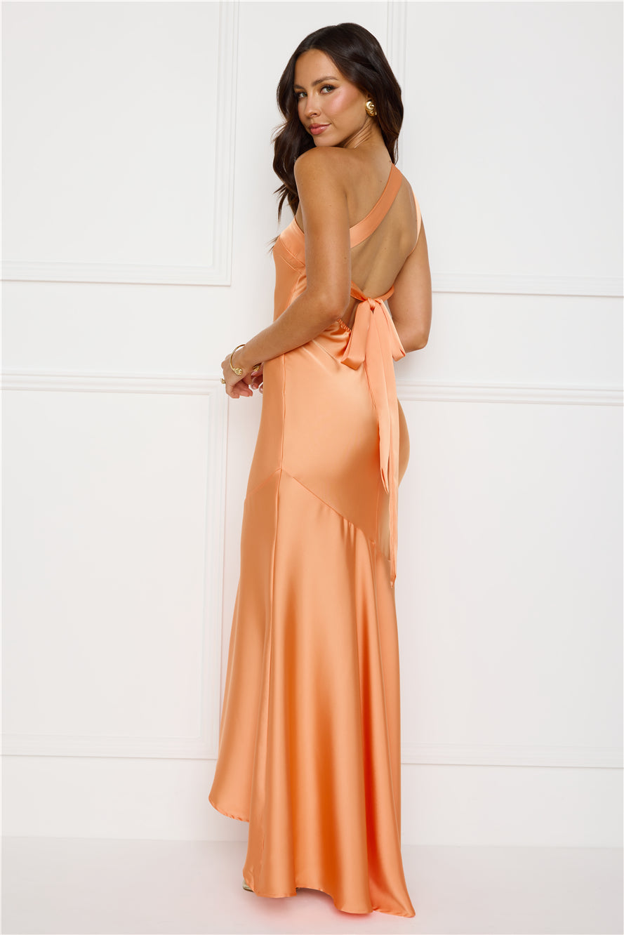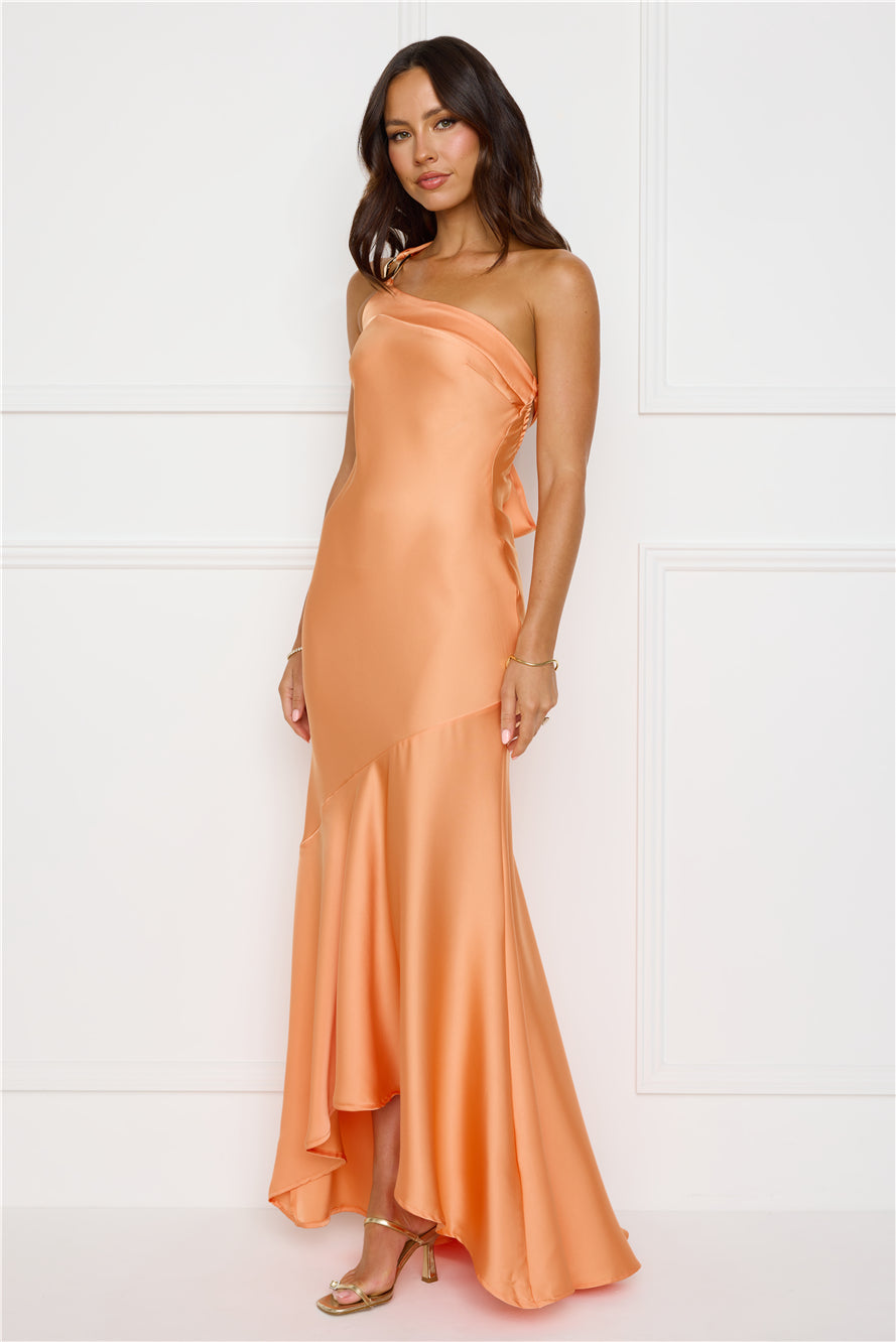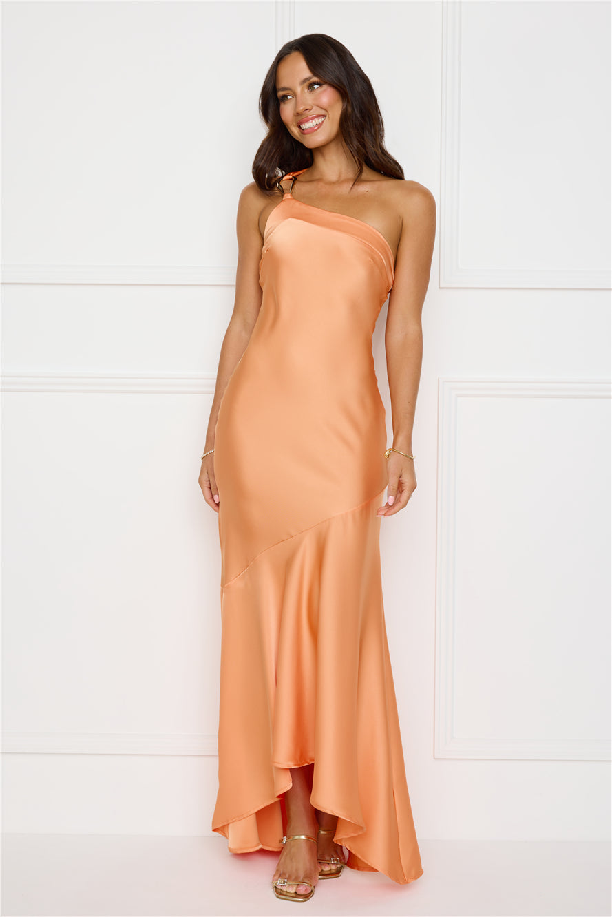 Steal the spotlight in the Masquerade Energy One Shoulder Satin Maxi Dress. It features a sleek satin finish. a chic one-shoulder neckline. luxe gold detailing. a statement back tie. and a flowy high-low skirt for a perfect touch of style. Pair with heels and sparkly accessories.