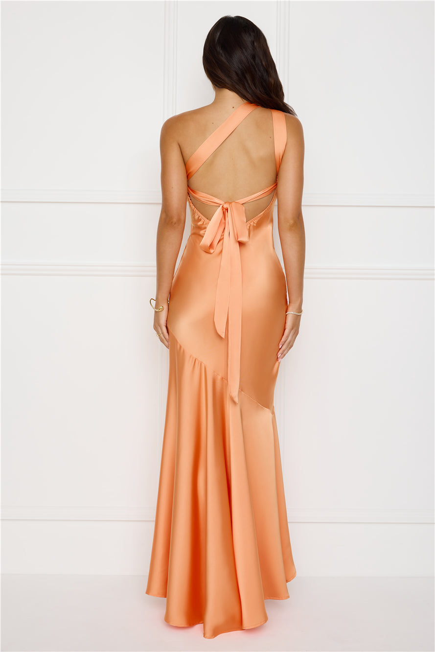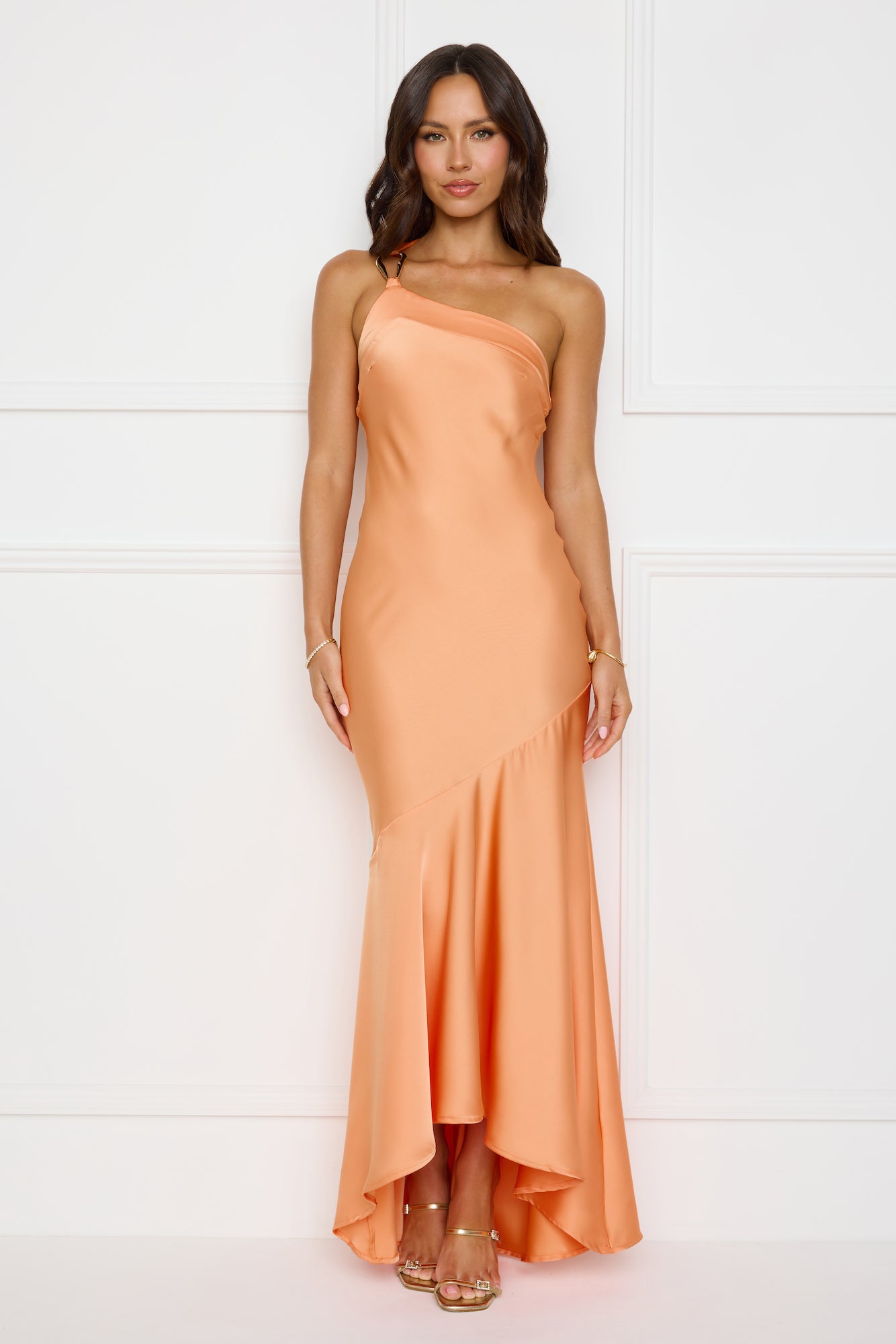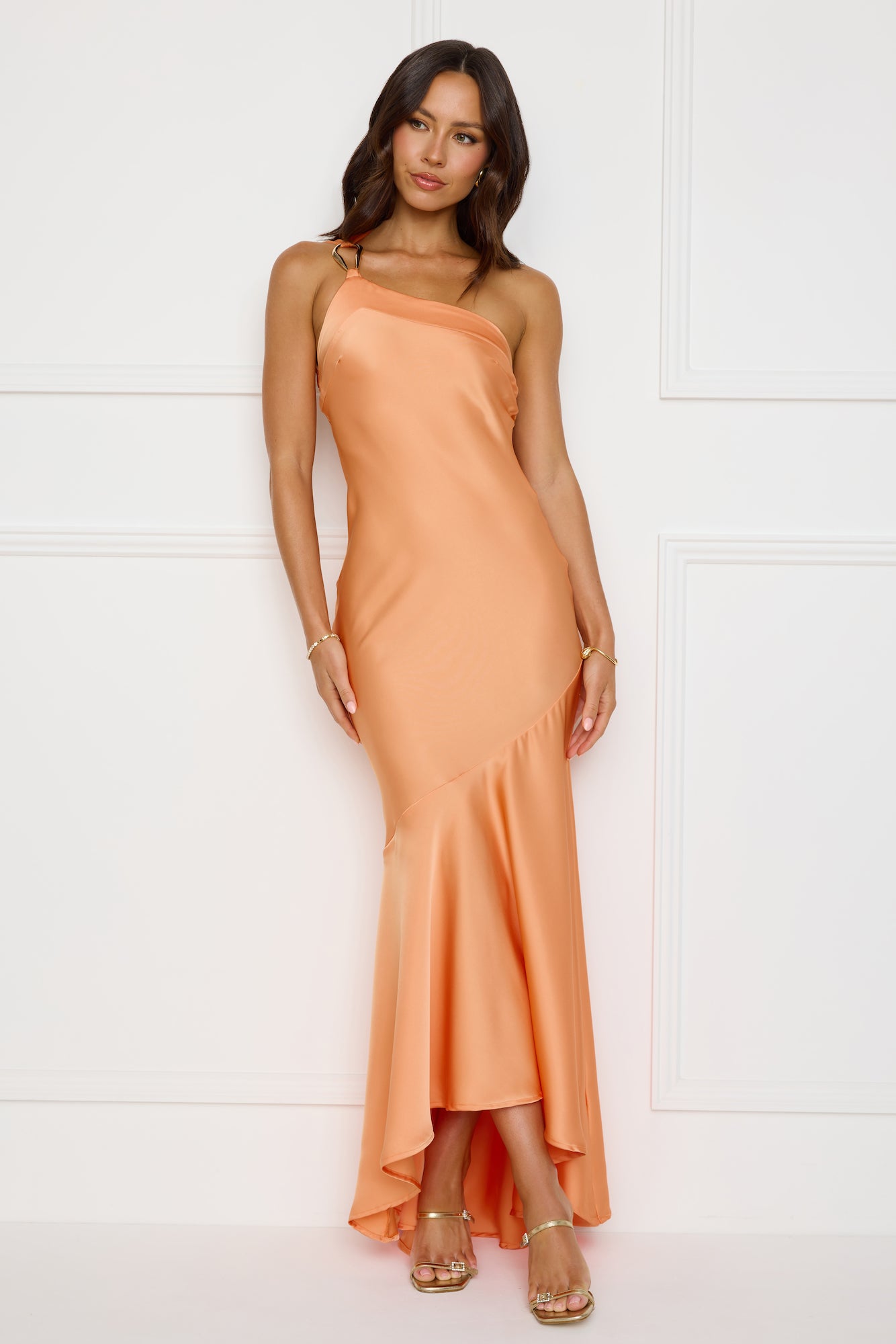Steal the spotlight in the Masquerade Energy One Shoulder Satin Maxi Dress. It features a sleek satin finish. a chic one-shoulder neckline. luxe gold detailing. a statement back tie. and a flowy high-low skirt for a perfect touch of style. Pair with heels and sparkly accessories.