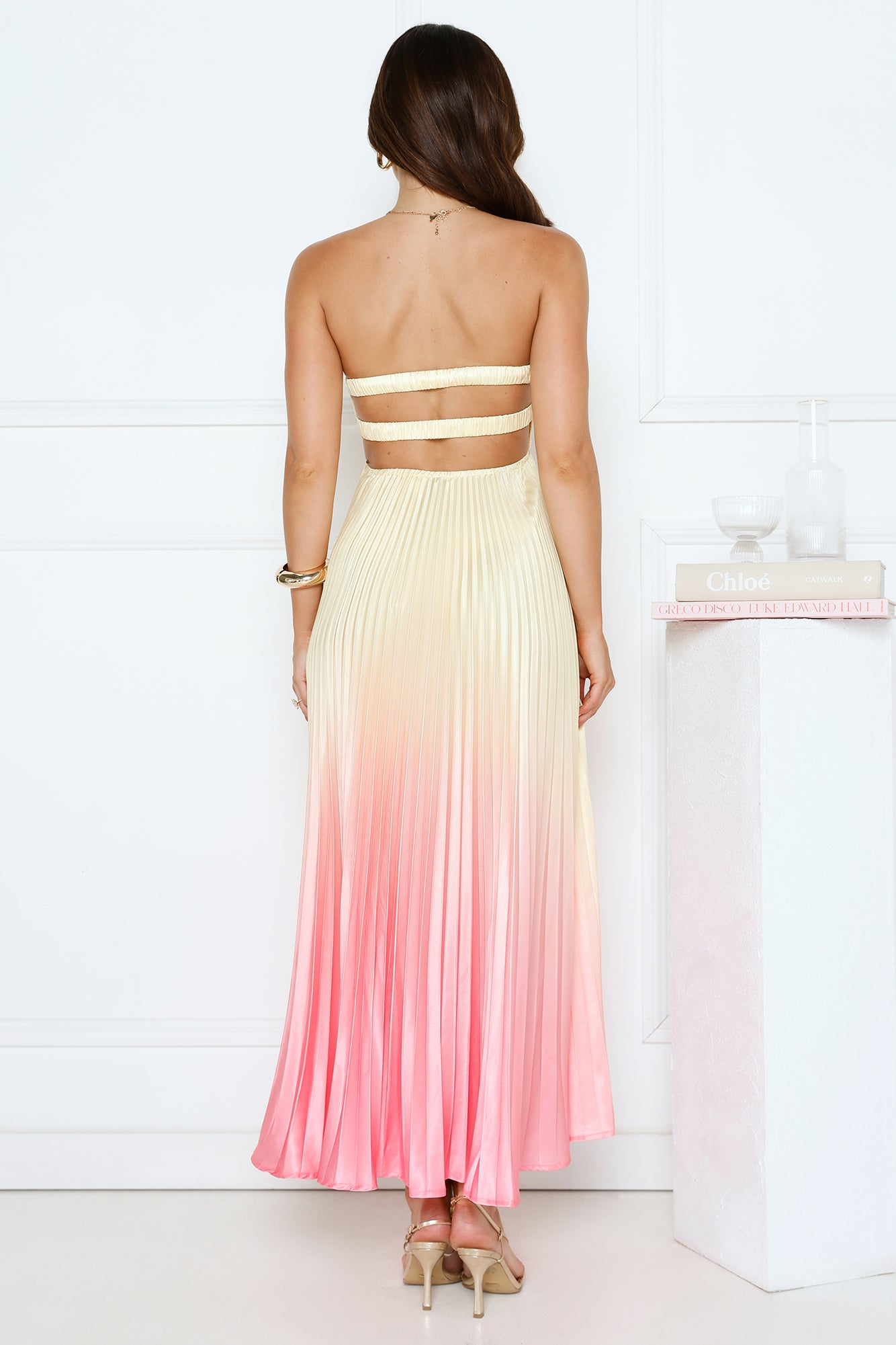 The Melting Sunset Satin Strapless Maxi Dress shines with its ombre pleated satin. strapless elastic back. and flowy skirt that moves like liquid sunset. Style with nude heels and delicate layered jewellery for a look that's effortlessly radiant.