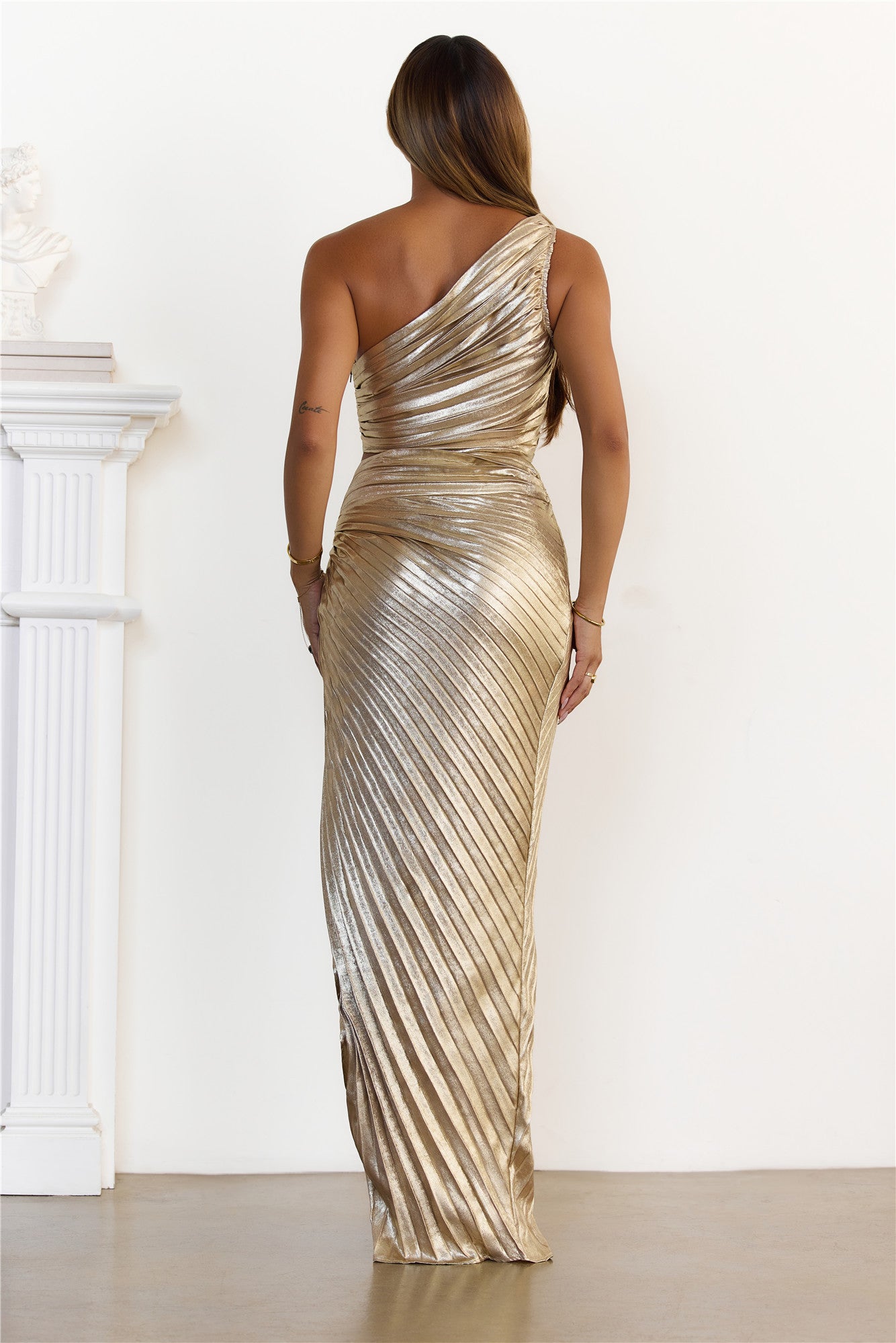Make a dazzling entrance in this show-stopping two-piece set. featuring a radiant metallic pleated fabric. The one-shoulder crop top perfectly complements the high-waisted maxi skirt. designed with a chic knotted detail at the front and a daring high leg split. This set is your ticket to turning heads at any special occasion. Pair it with strappy heels and delicate gold accessories for an unforgettable look.