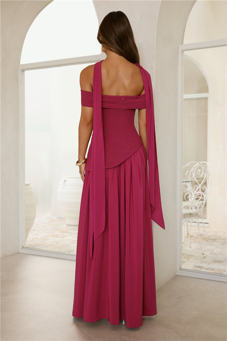 Make a grand entrance in our stunning Off-Shoulder Slit Maxi Dress. This gorgeous gown features a sophisticated off-the-shoulder neckline with a chic folded detail. a high slit. and a flowing skirt. Complete with an elegant neck scarf for added drama. it's designed to make heads turn. Style with barely-there heels. a delicate clutch. and statement earrings for a show-stopping formal event or glamorous evening out.