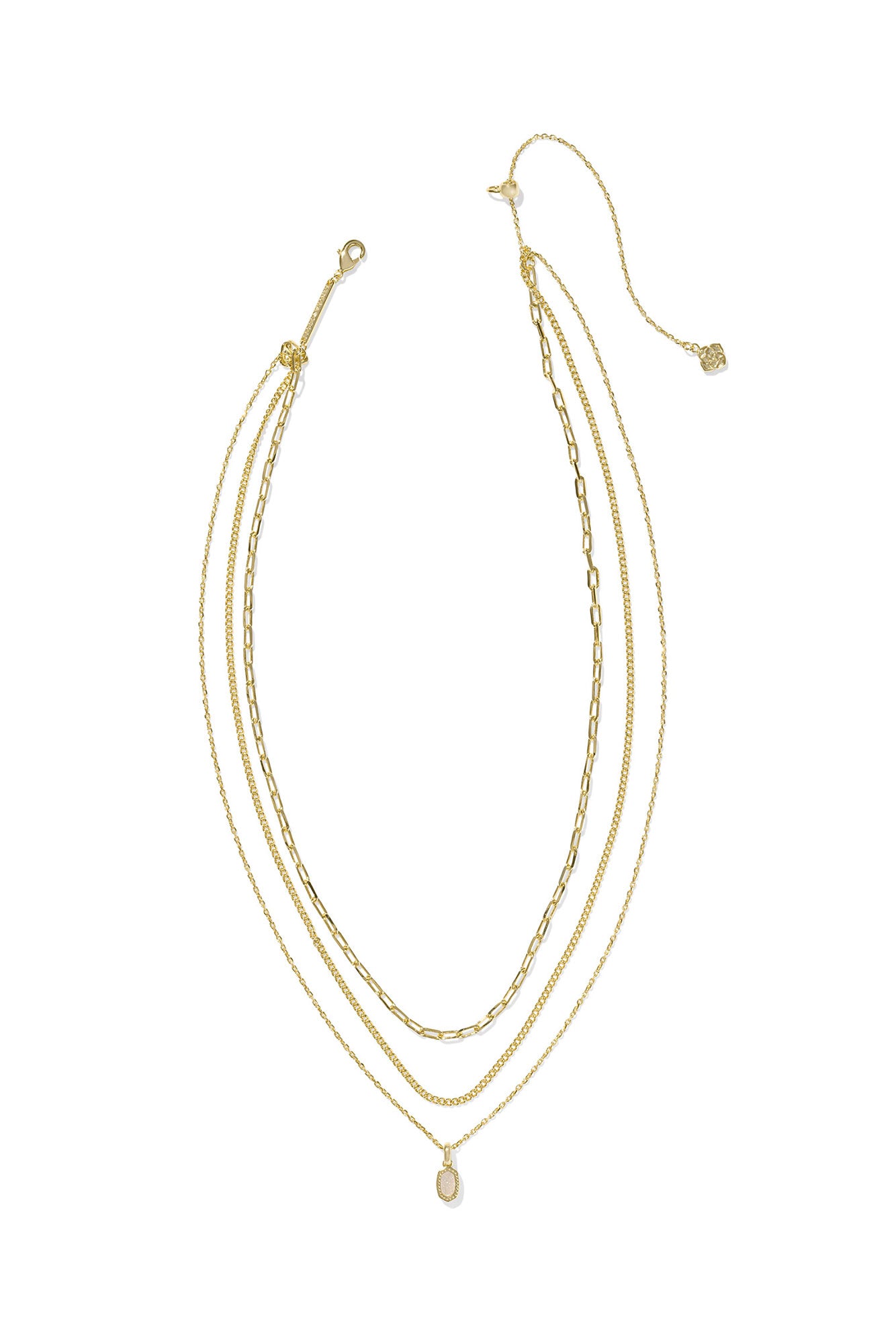Consider your necklace stack handled with the Mini Elisa Gold Triple Strand Necklace. Three distinct chains topped off with a dainty mini Elisa. this is the perfect grab-and-go piece to pull off an effortlessly layered look.