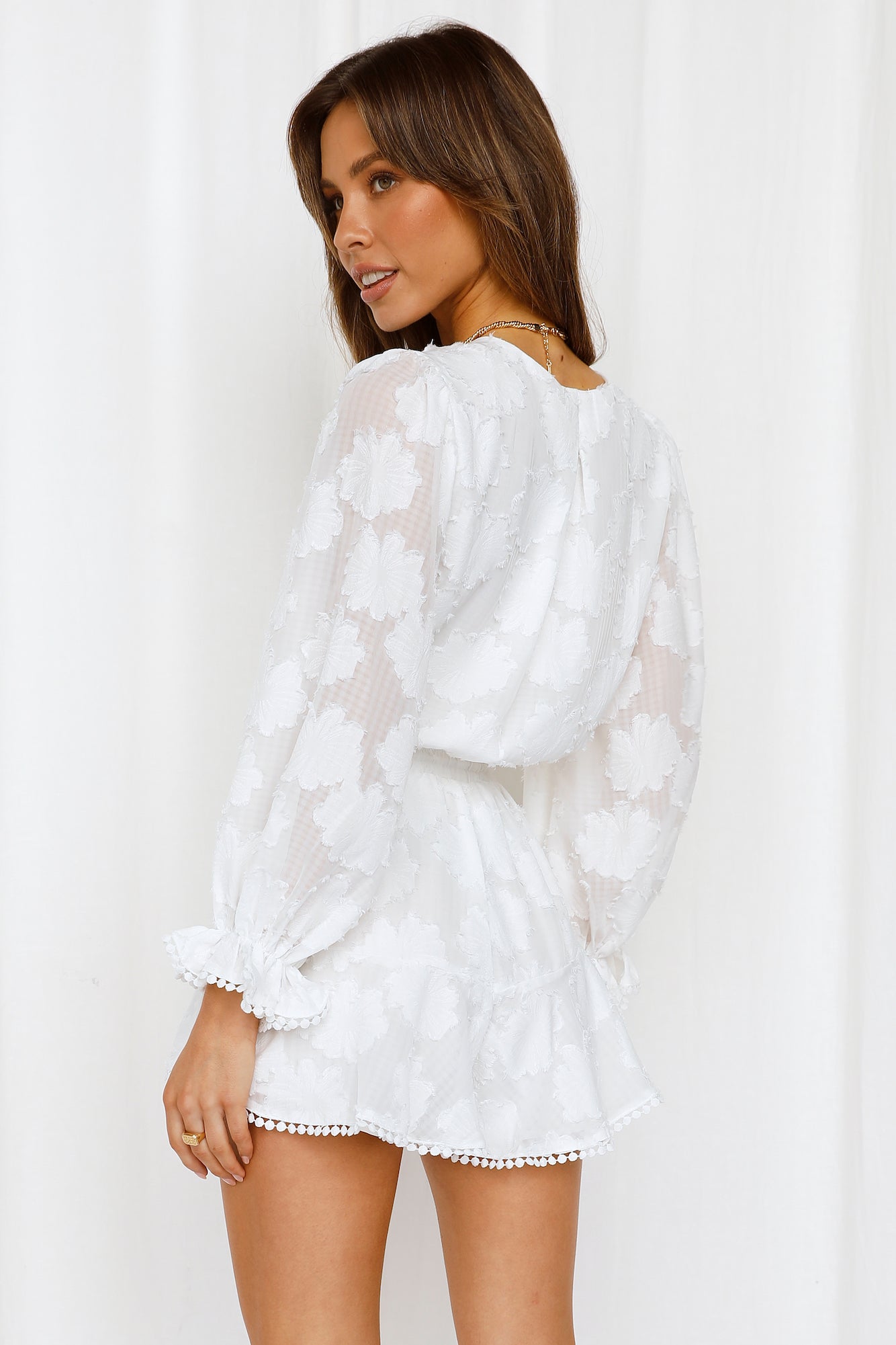 - Floral printed long sleeve playsuit.