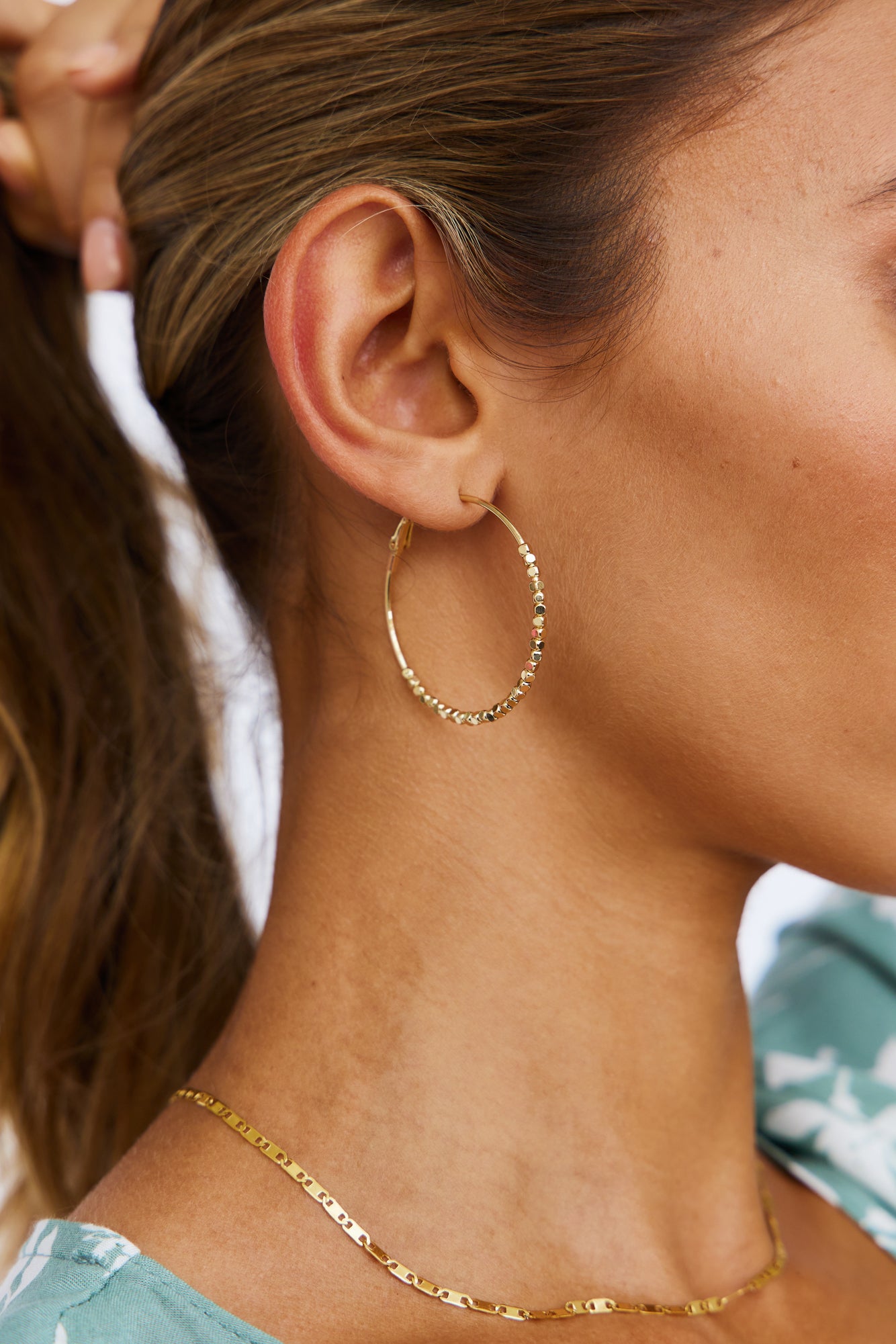- Gold hoop earrings.
