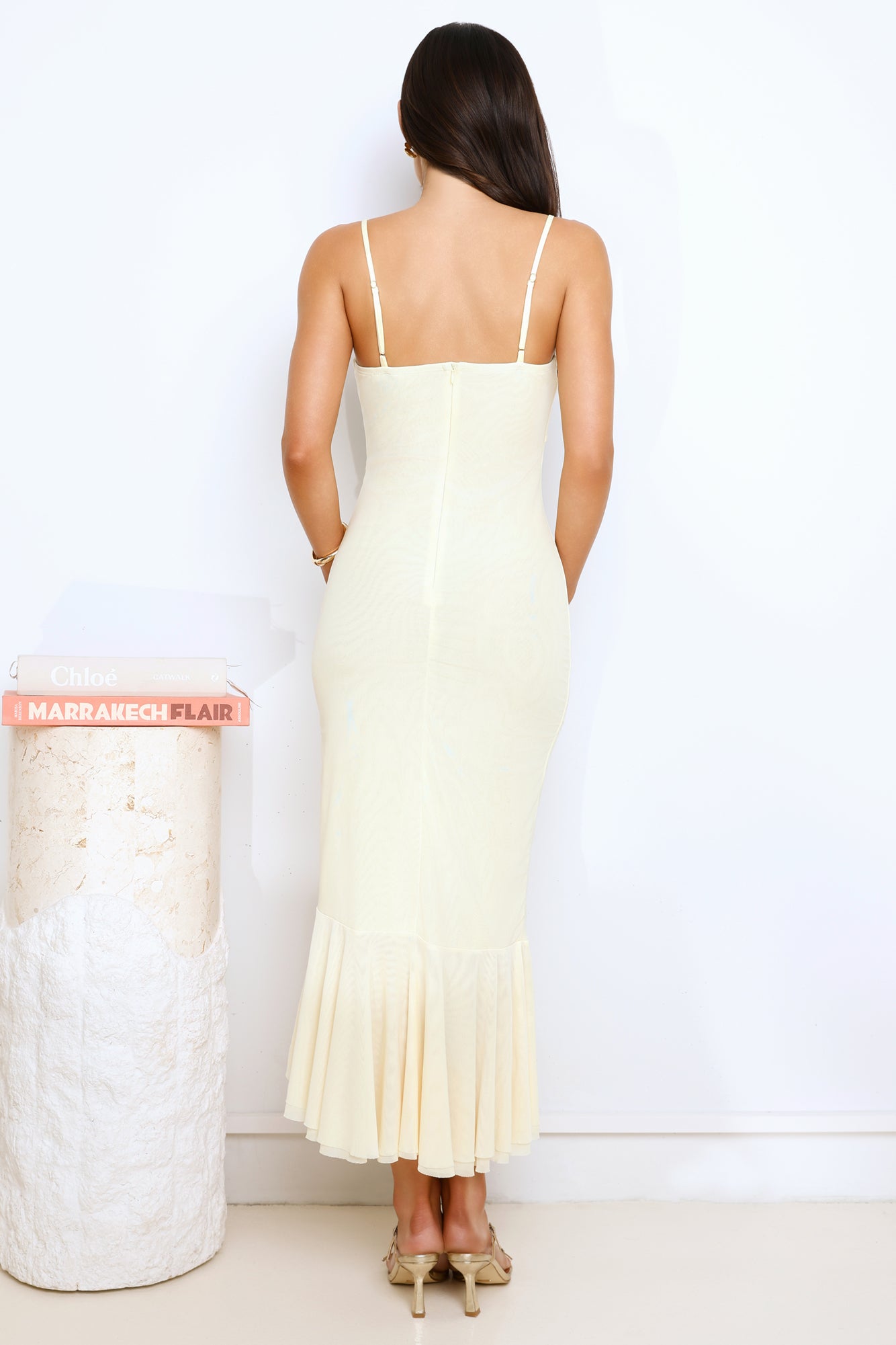 Elevate your look with the Not Just A Vibe Mesh Midi Dress. It features a stretch mesh fit. a twist neckline and a split with a frill detail. Style with heels and show off!