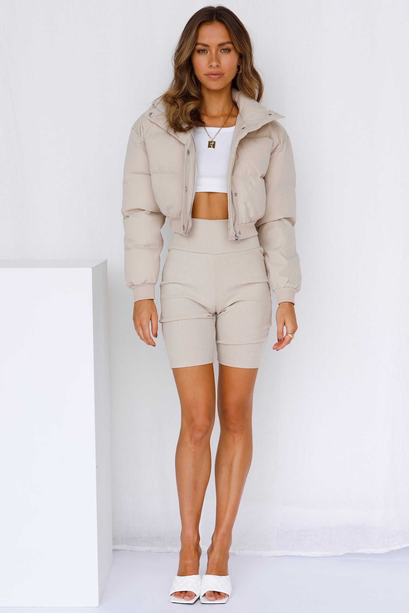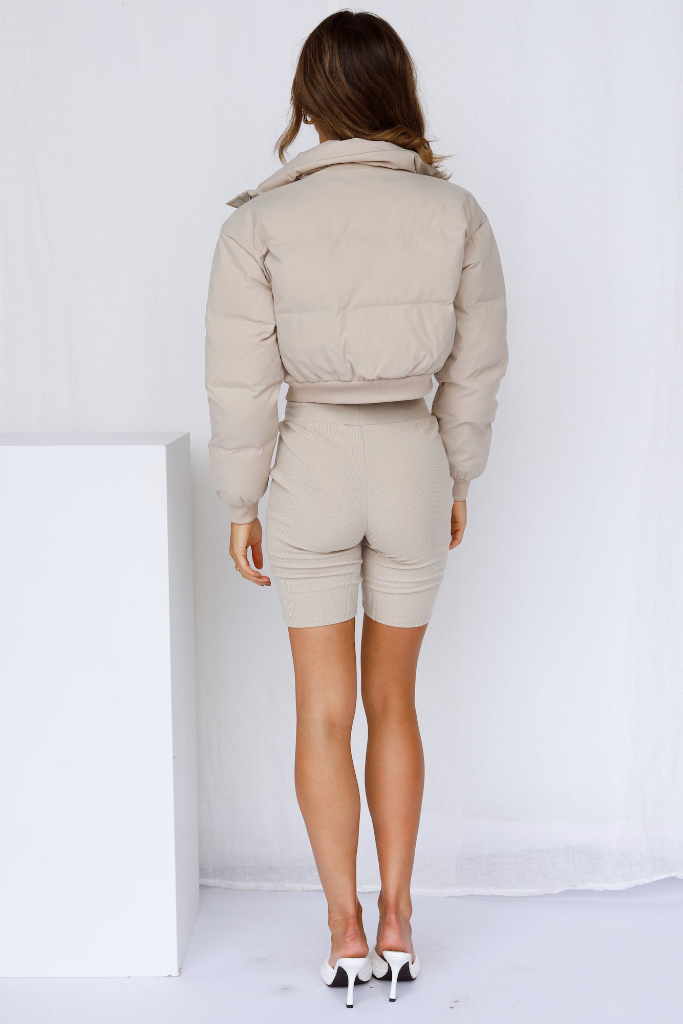 - Beige puffer jacket.