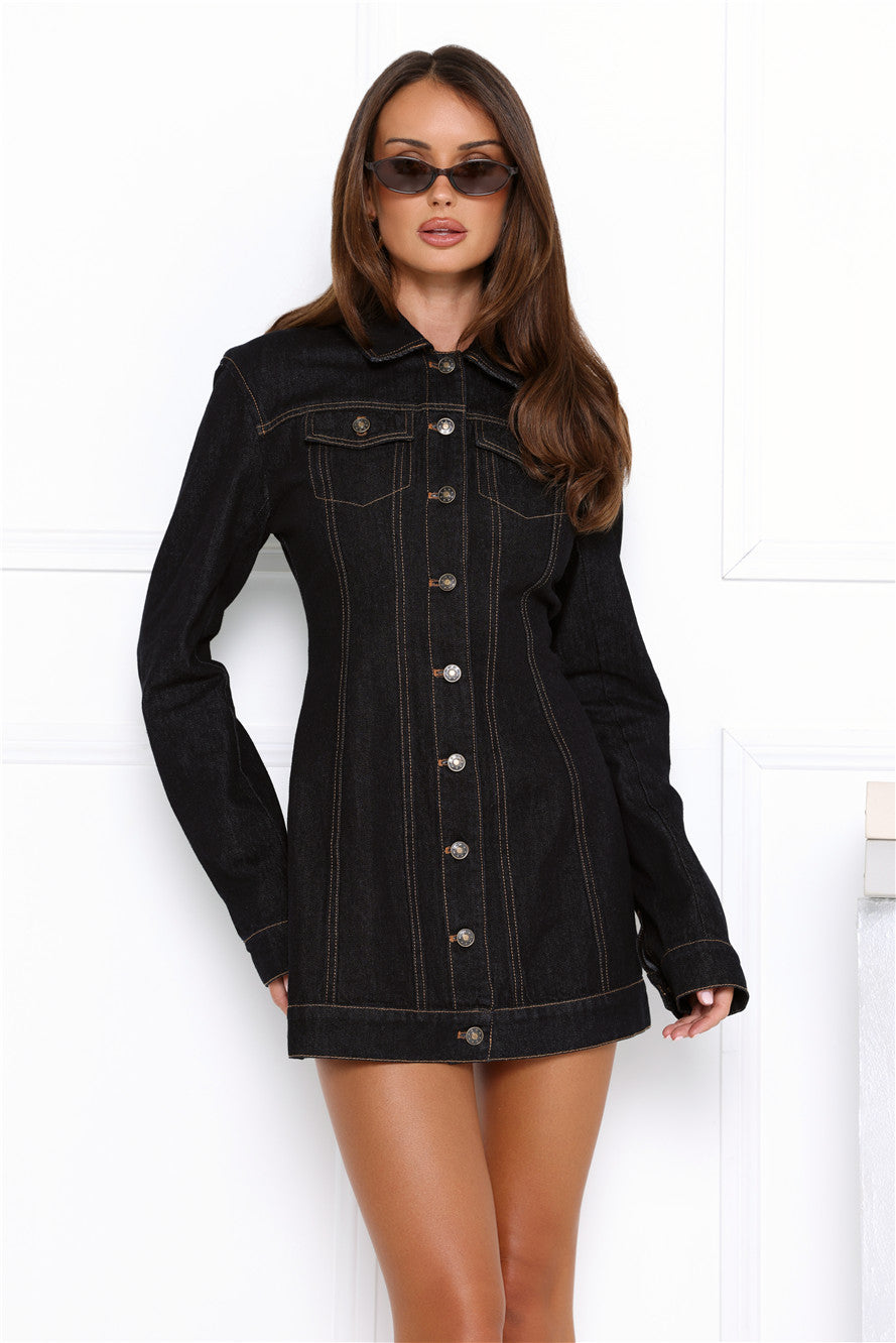 Rock a timeless chic look with the Rider Denim Mini Dress. Featuring a true-to-size fit. collared neckline. button front. long sleeves. and contrast stitching. this mini dress brings effortless style with a touch of edge. Style it with heels.