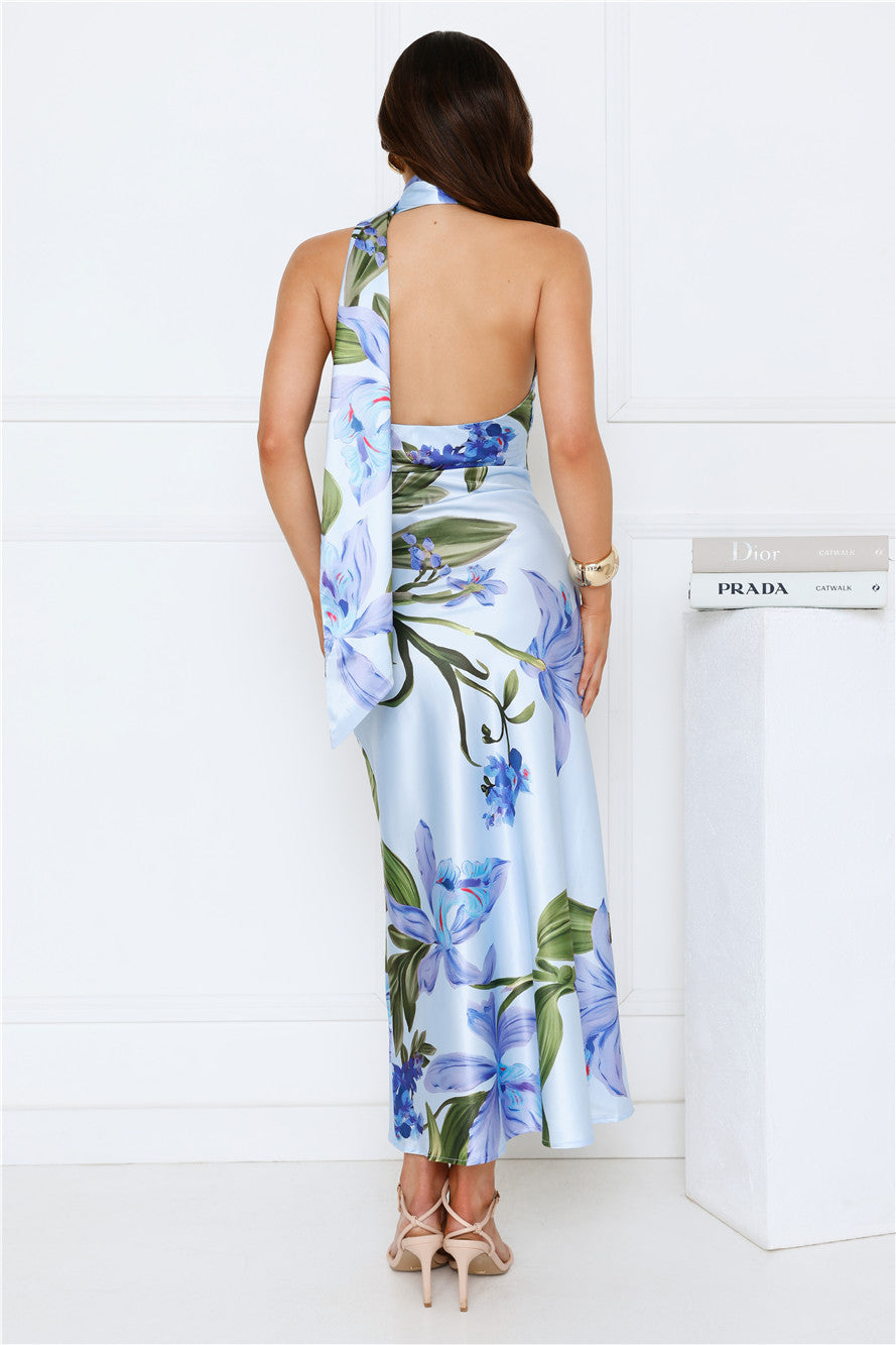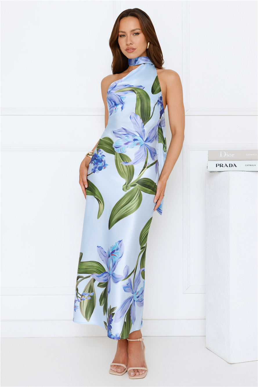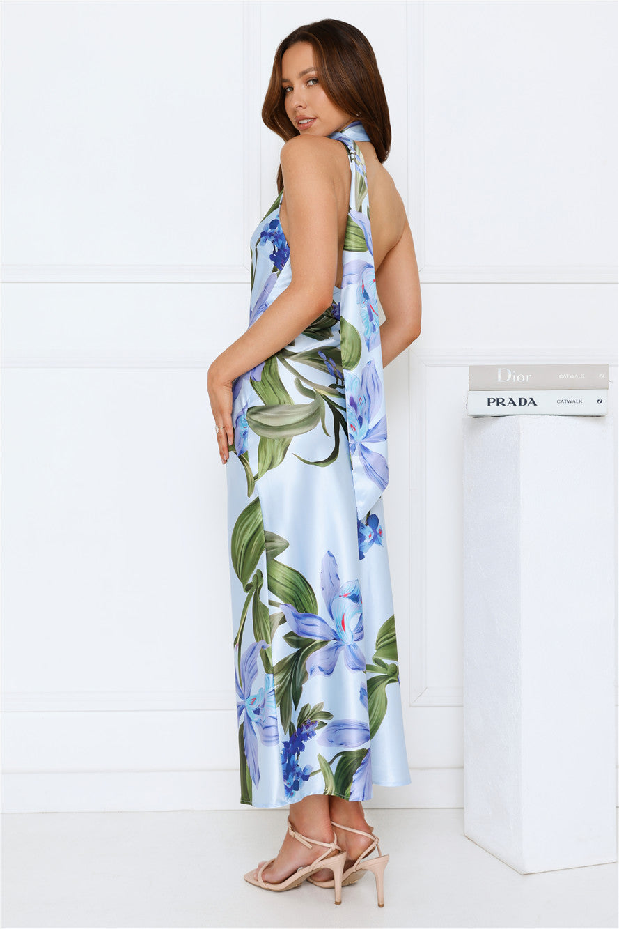Step into effortless elegance with the Romance In Bloom Satin Maxi Dress. Designed from stretch satin. this flowy maxi features a flattering elastic back. a chic neck wrap. and a delicate floral design. Perfect for garden parties. daytime events. or any occasion where you want to feel romantic and feminine.