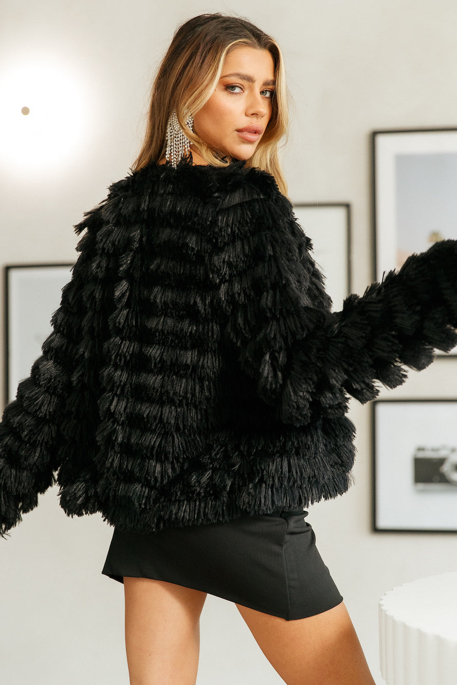 Extra plush and soft. we're setting the standard for party season with the hottest trends and finishes. and the Shake It Out Jacket is no exception! We're giving this instant add to cart asap style a five-star rating with its extra fluffy faux fur finish throughout. trending boxy silhouette and a cropped hem. We're teaming ours with classic denim jeans. sky-high pumps. and a newspaper boy cap for some mega Clueless vibes.