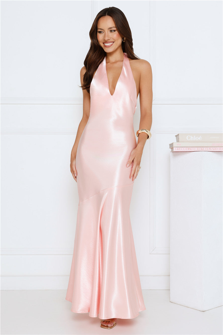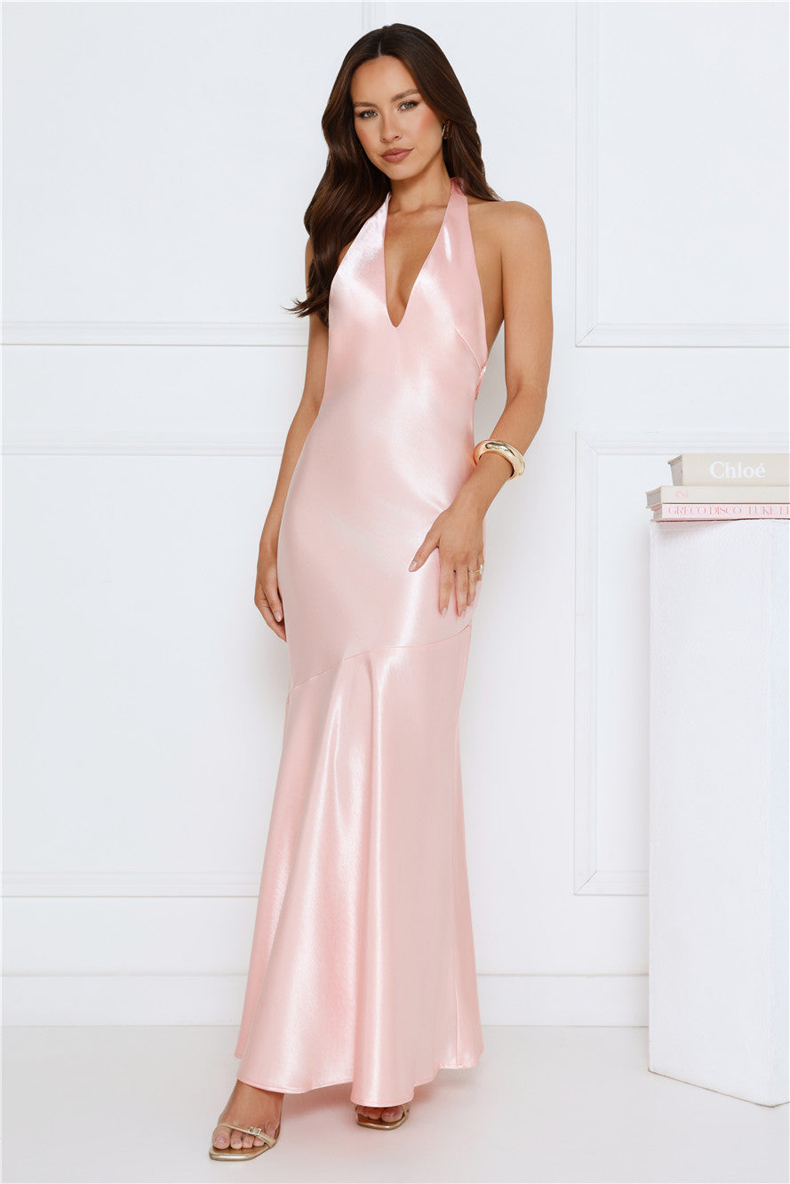 The Softly Yours Satin Halter Maxi Dress features a flattering V-neck and halter design. complemented by a removable gold sun chain that adds subtle sparkle to the back. With a flowy skirt that moves beautifully. this dress is perfect for romantic evenings—pair with strappy heels and delicate jewellery to complete the look.